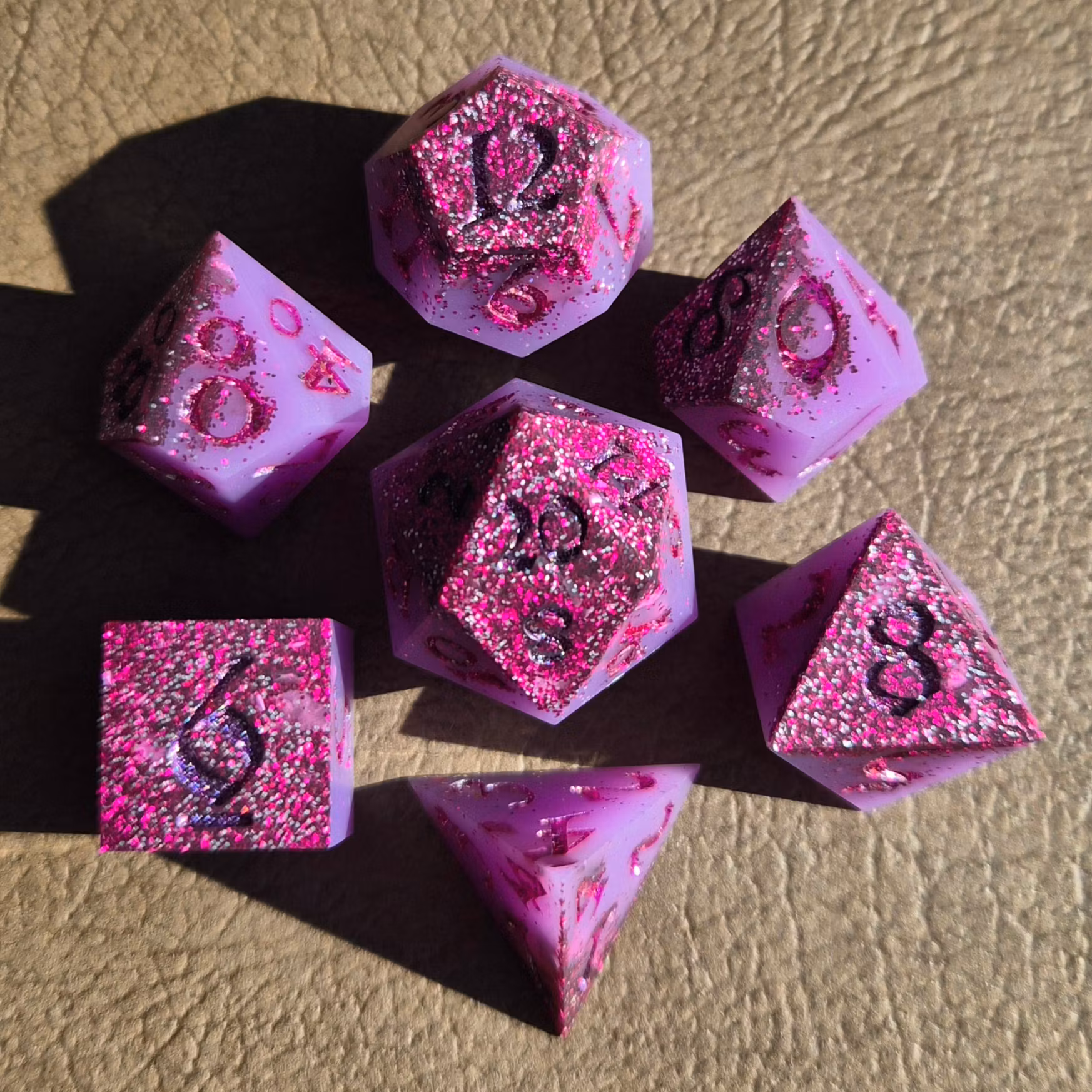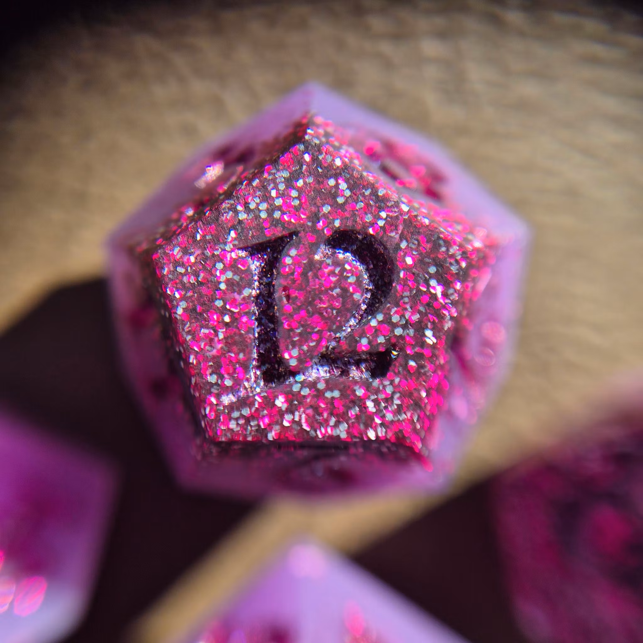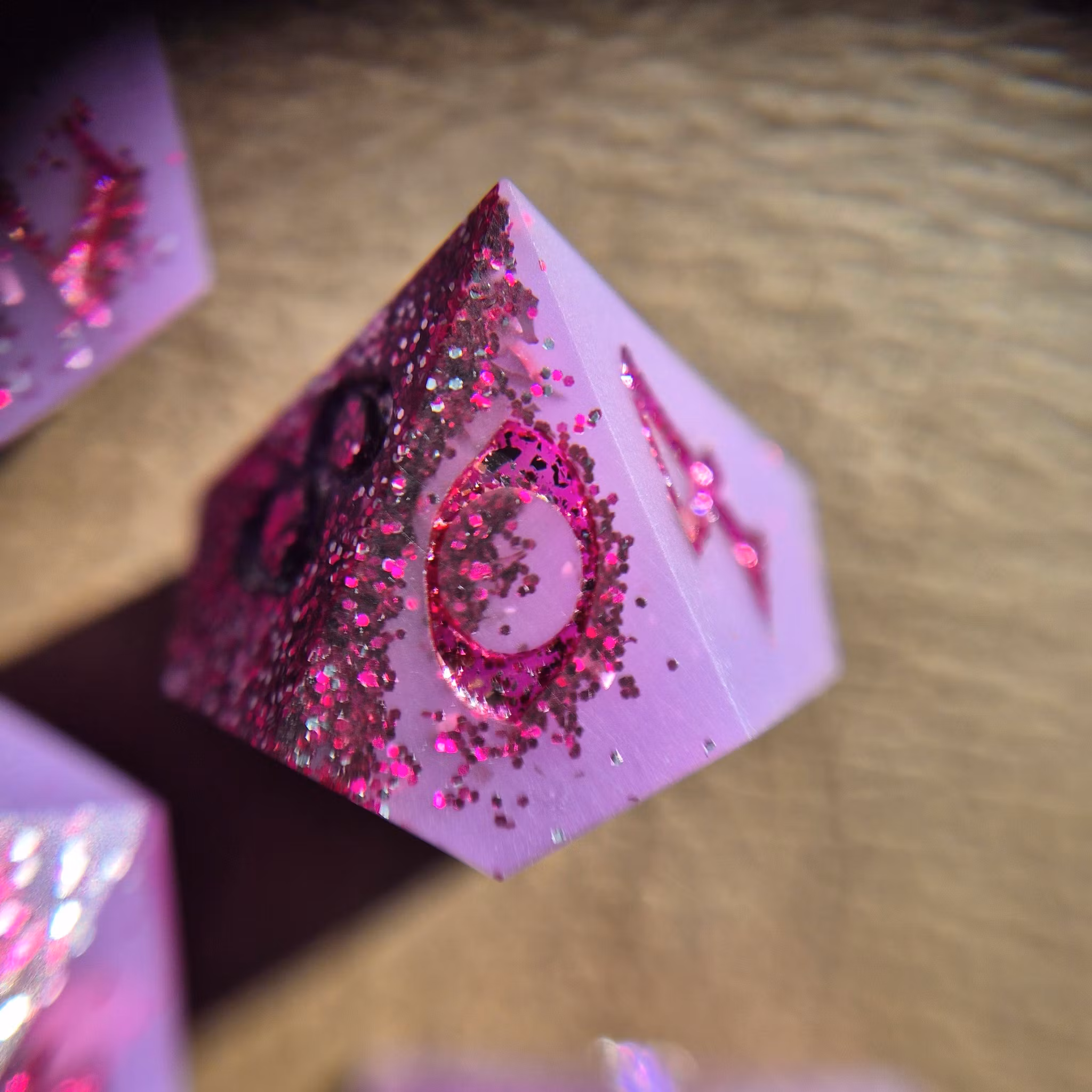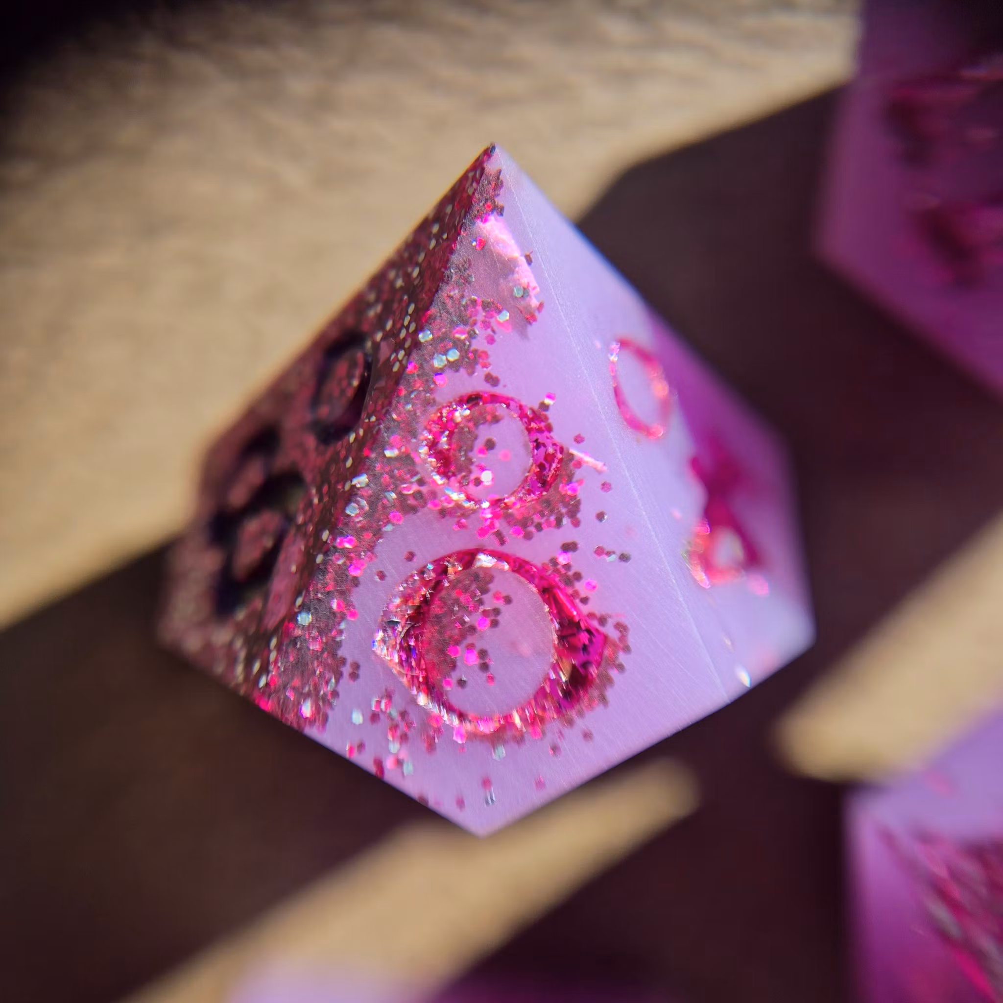 Bubblegum pink dice with concentrated sparkles on the high faces, the glitter is pink and purple, inked in pink and purple. Polished to a matte finish.Crafted w