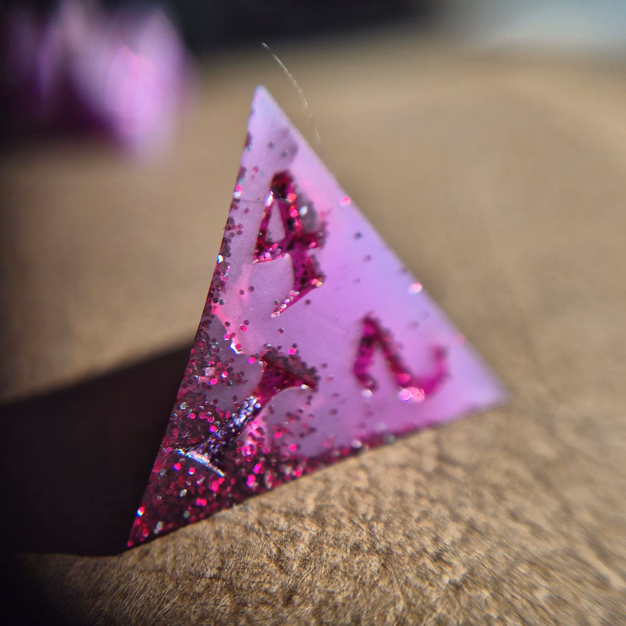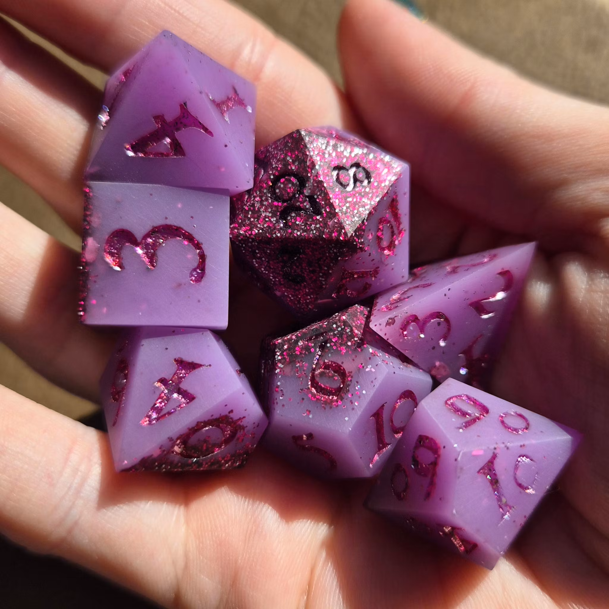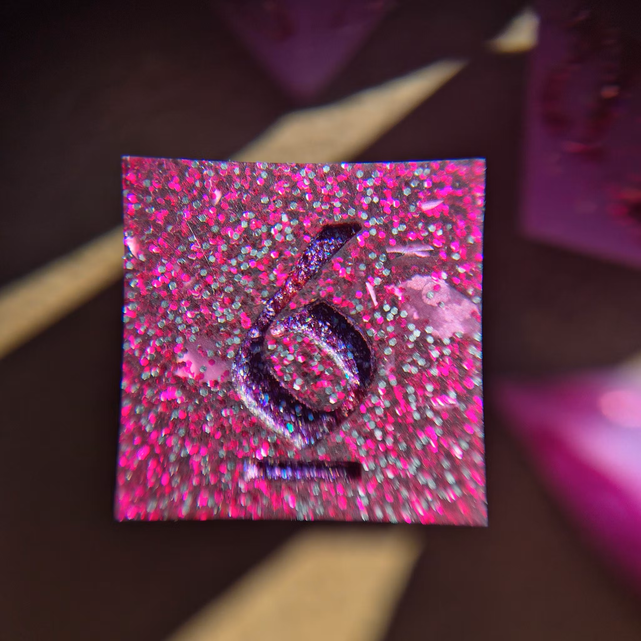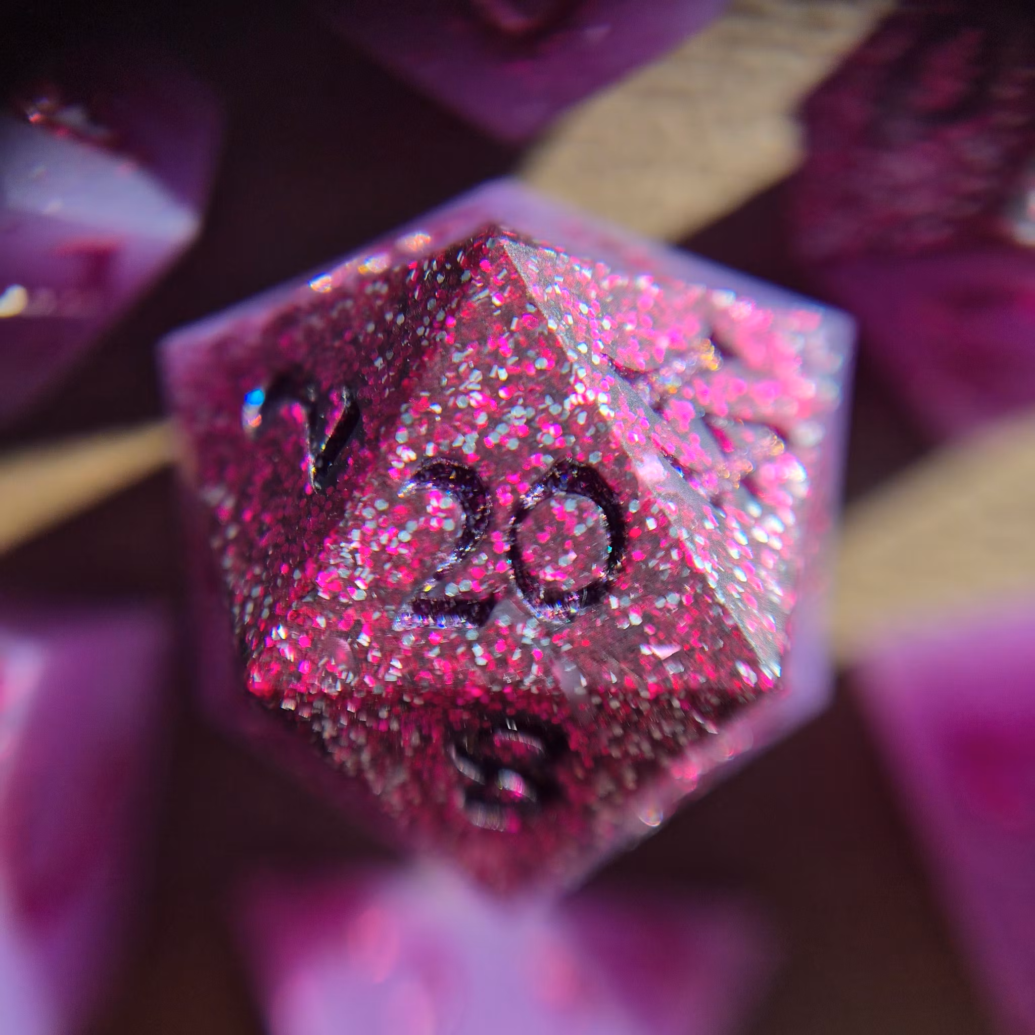Bubblegum pink dice with concentrated sparkles on the high faces, the glitter is pink and purple, inked in pink and purple. Polished to a matte finish.Crafted w