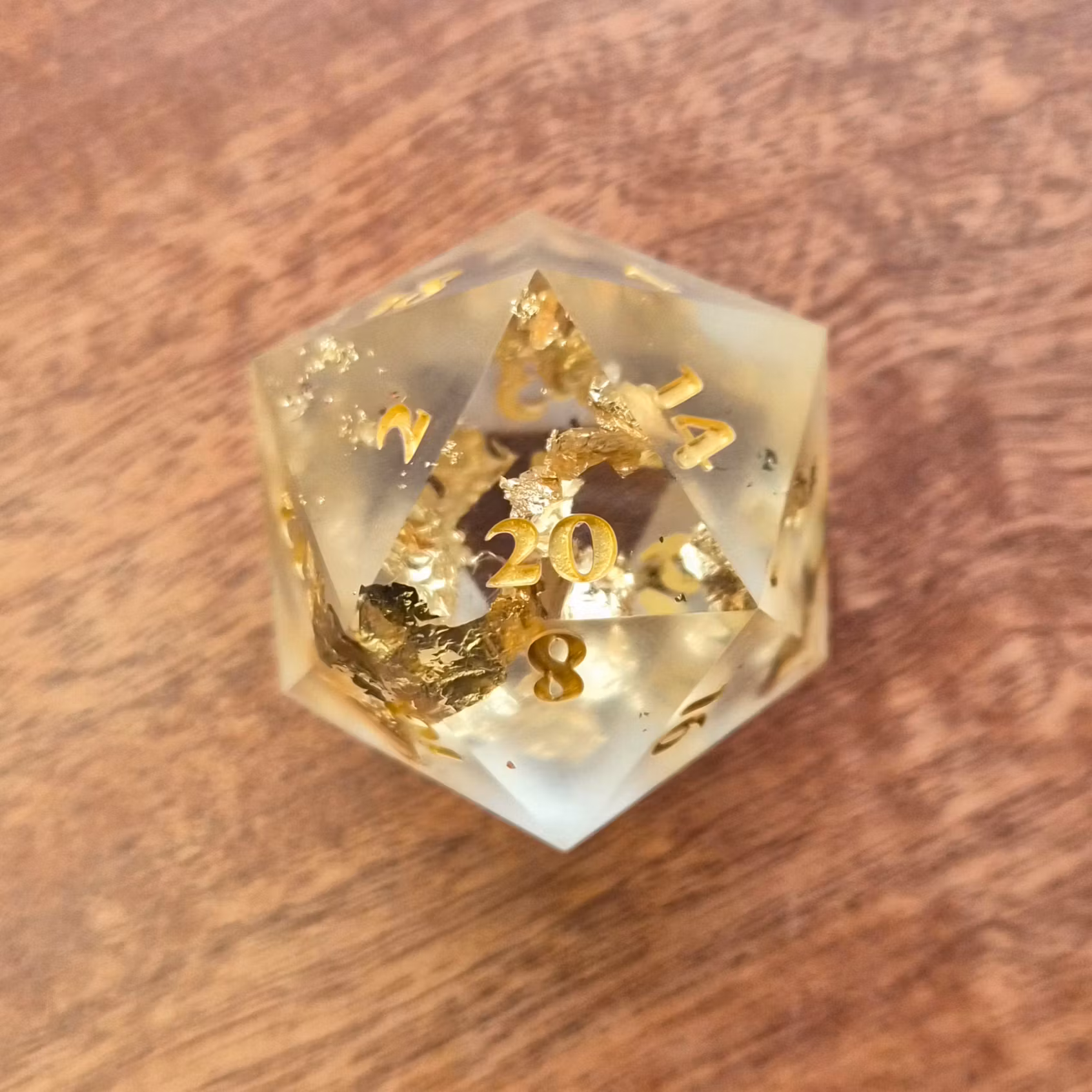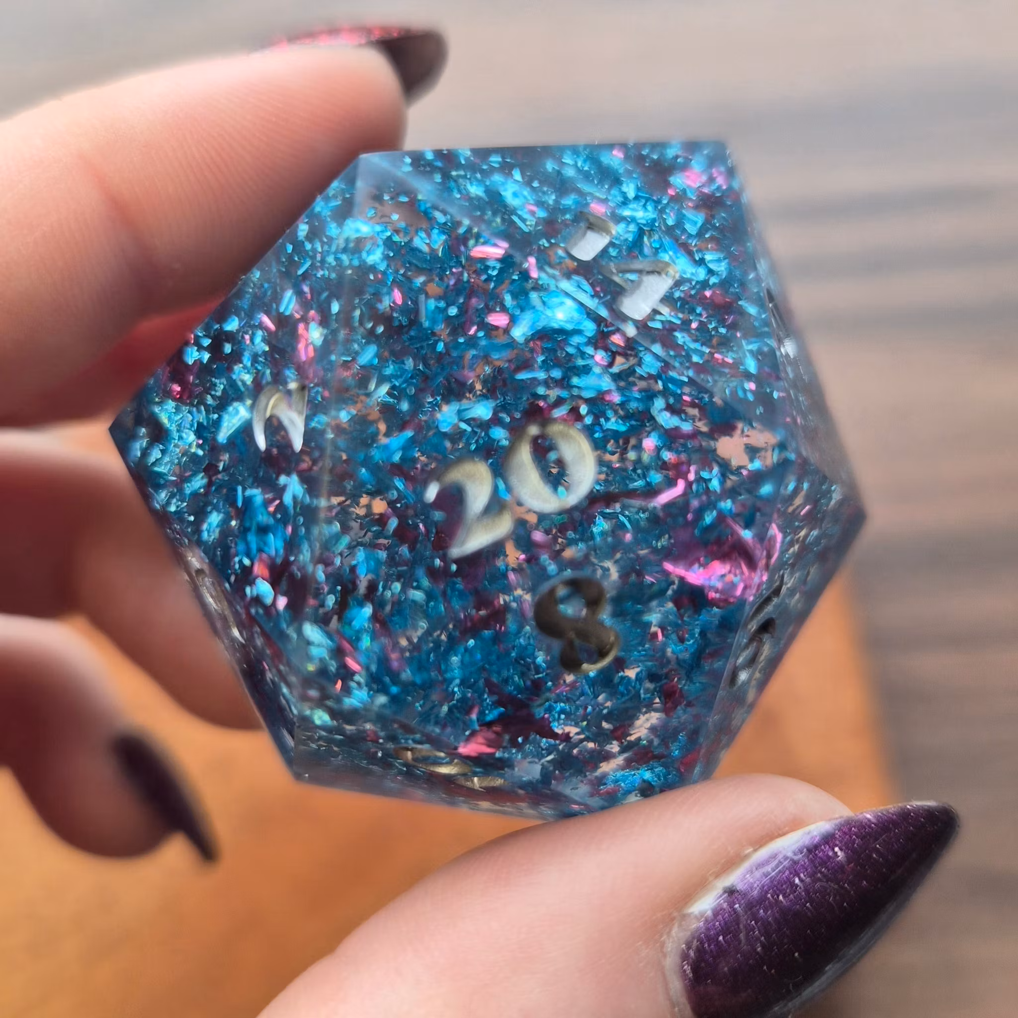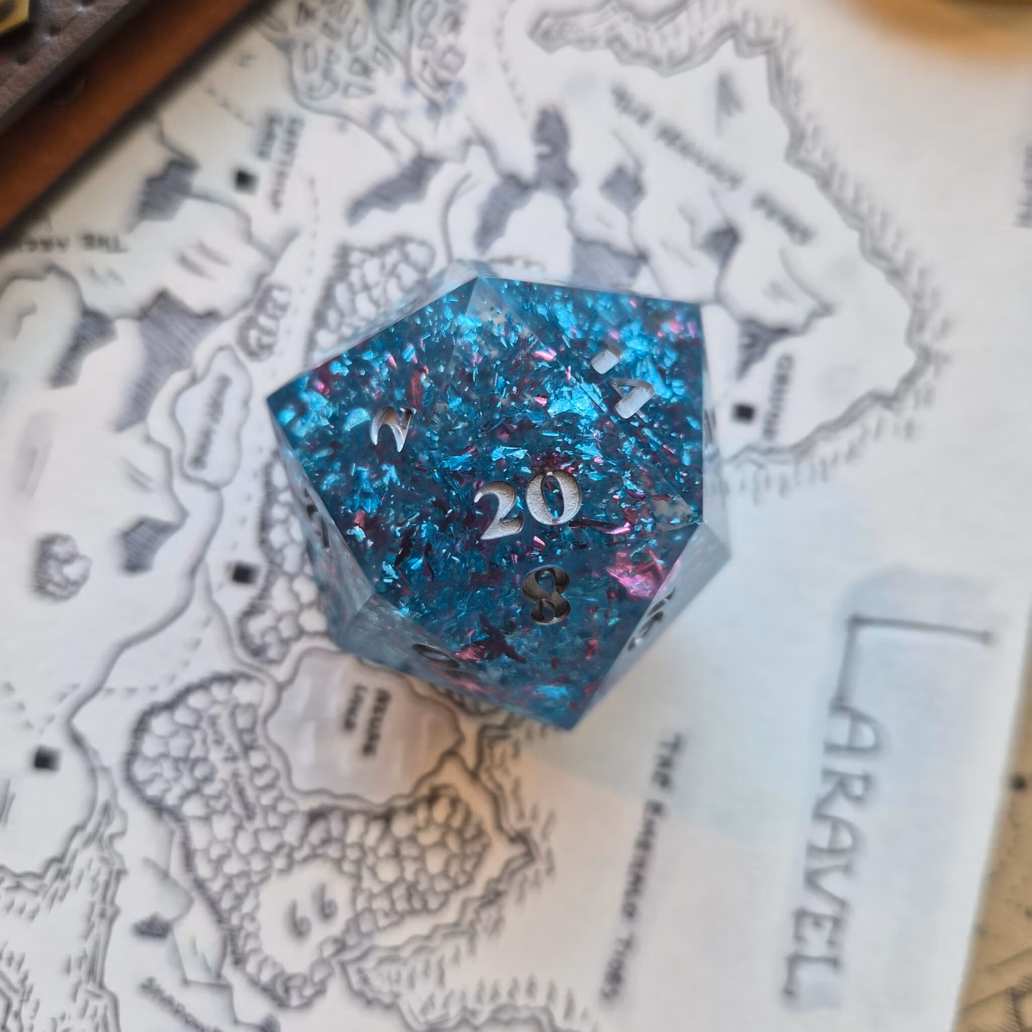 Chonk 40mm D20s!Imitating Midas' Touch, it is a transparent base with gold flakes and gold numbers. Window finish. - 1 IN STOCKBlue base with blue and pink meta
