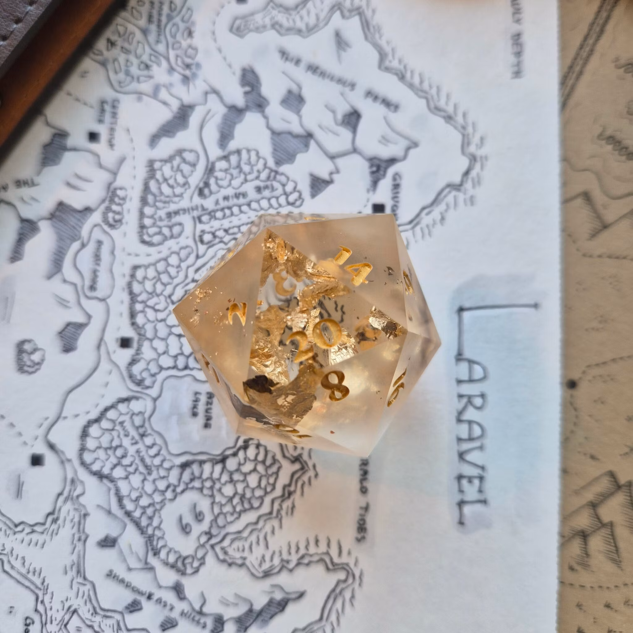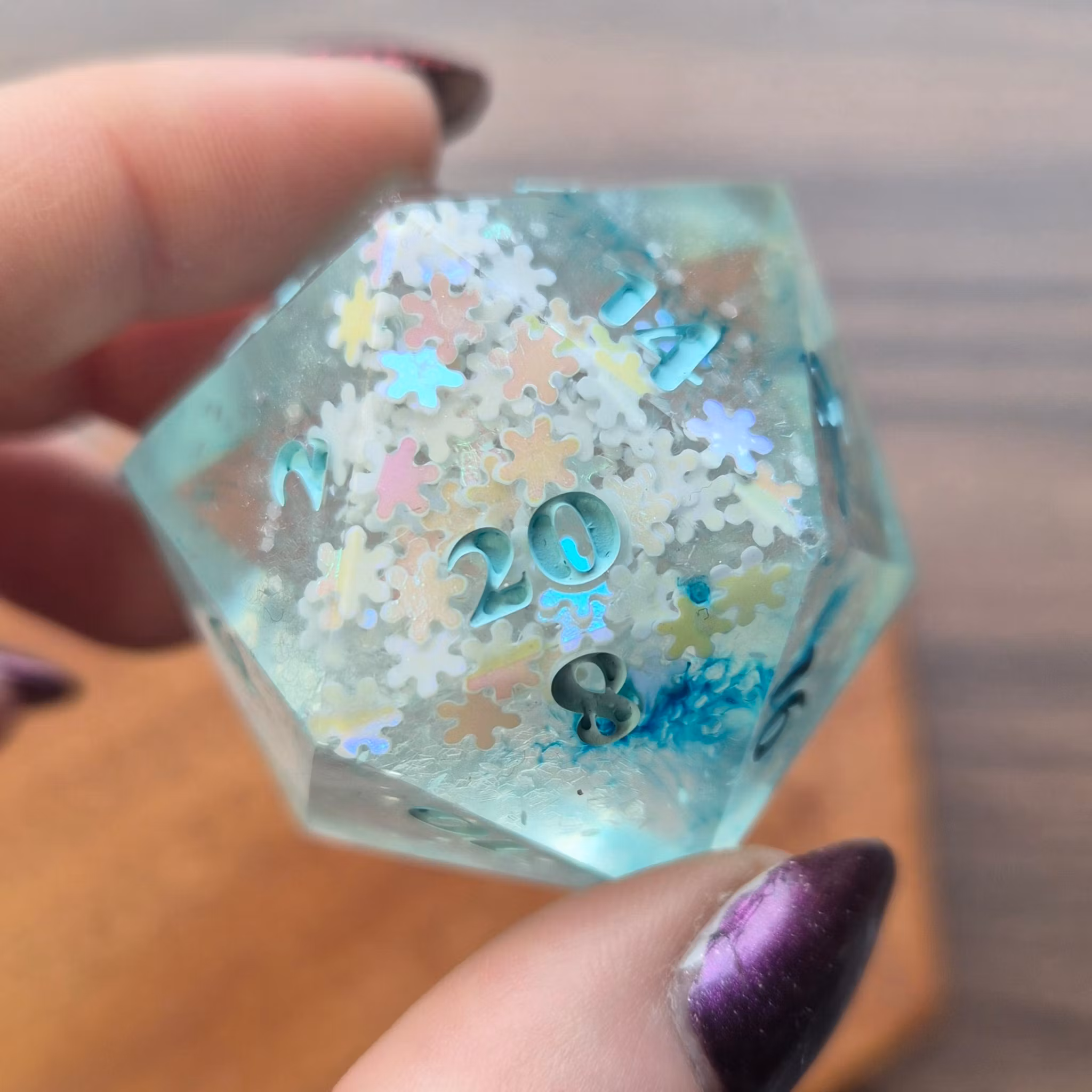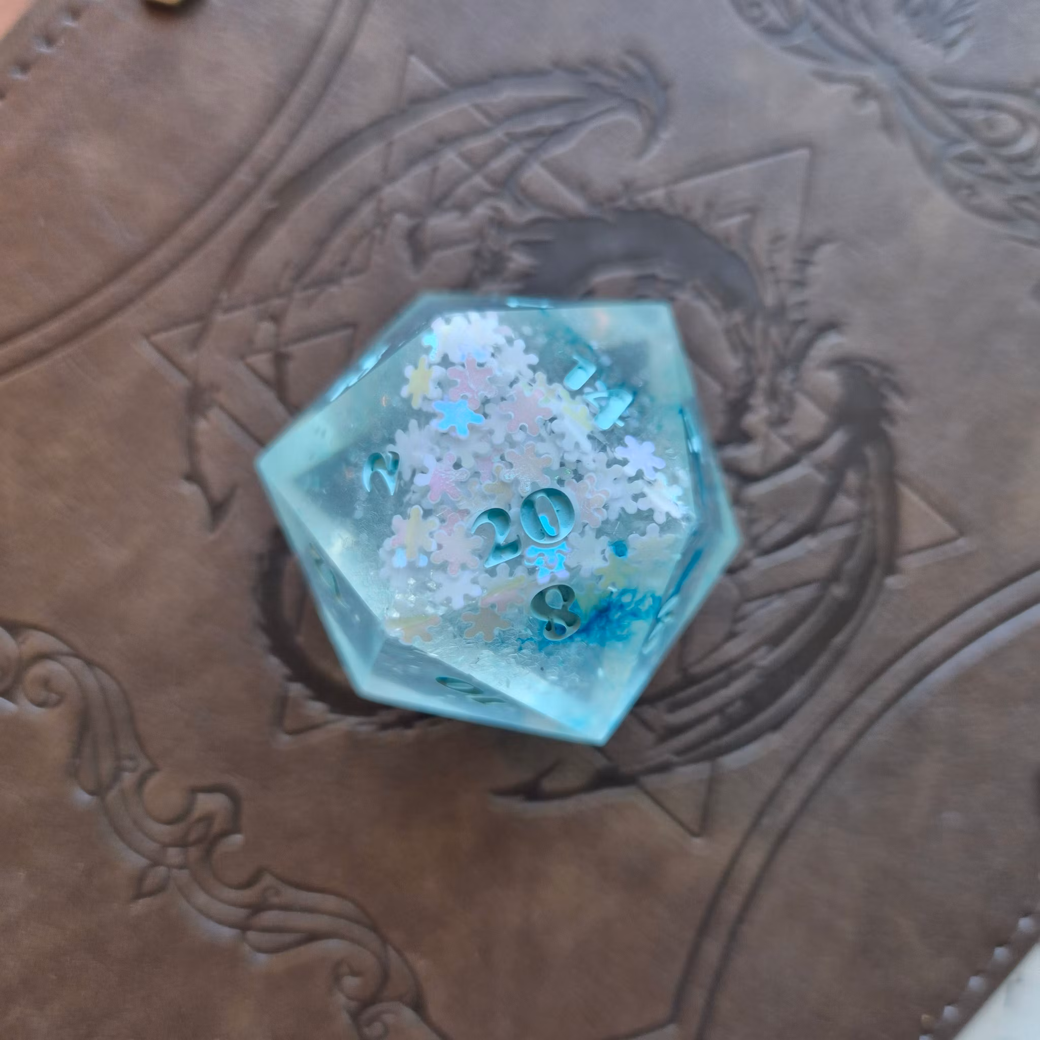 Chonk 40mm D20s!Imitating Midas' Touch, it is a transparent base with gold flakes and gold numbers. Window finish. - 1 IN STOCKBlue base with blue and pink meta