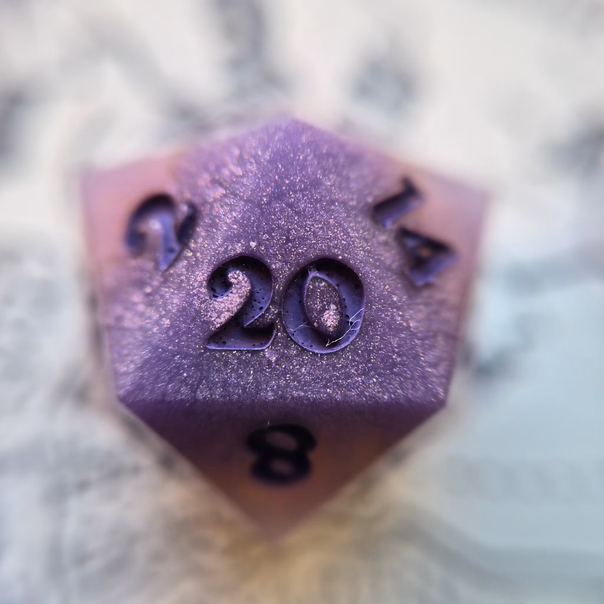D20 and D6 duo sets!A blue/purple-to-pink gradient, with hints of orange, inked in a deep purple. Matte finish.Crafted with Magic.Note. These are handmade sharp