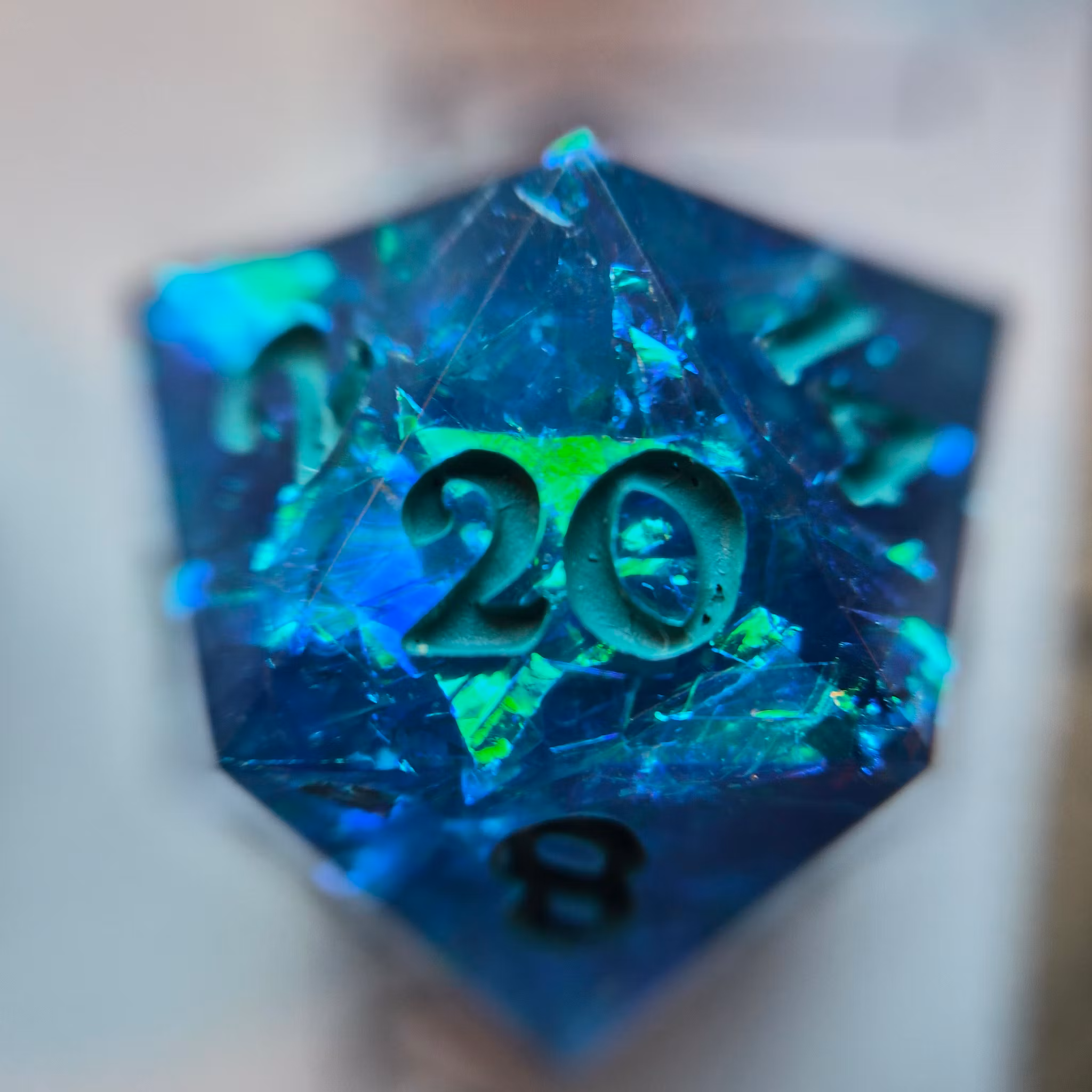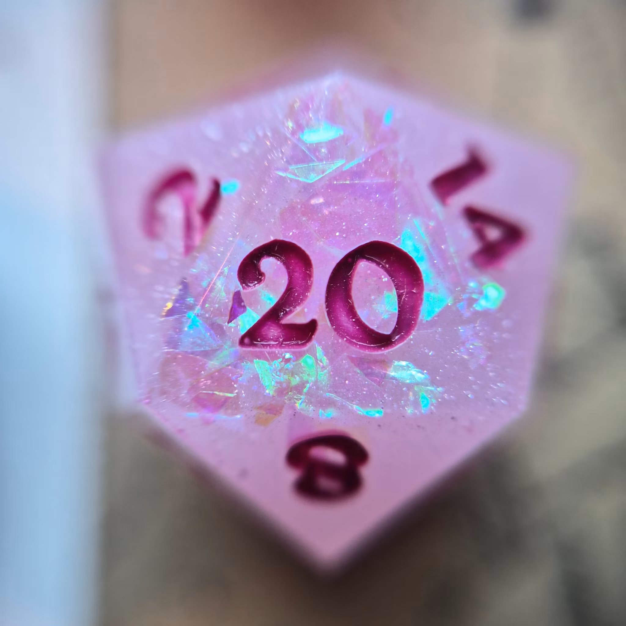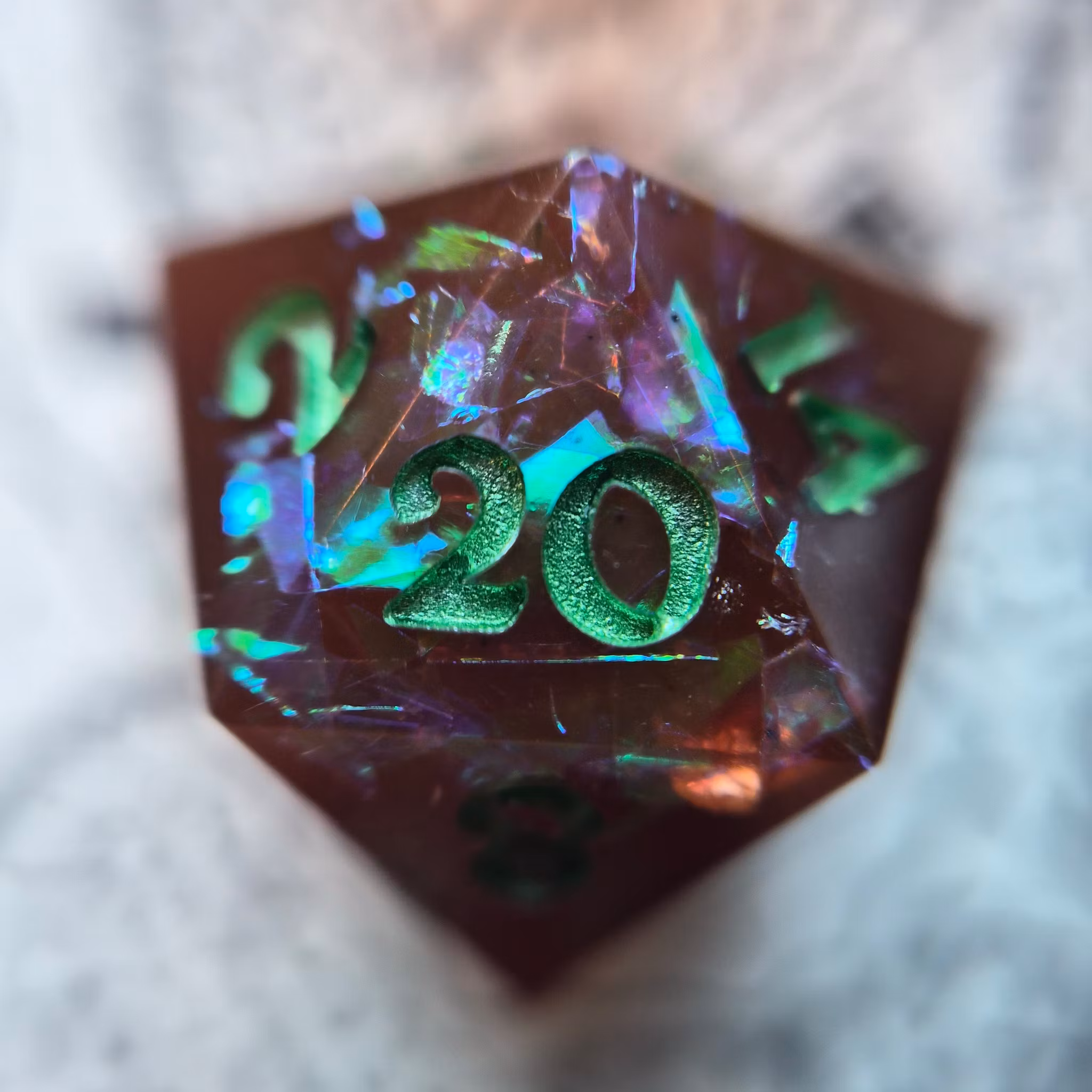 Rich burgundy contrasted with a bright metallic emerald green and holographic flakes. Window finish. There are two of this D20.