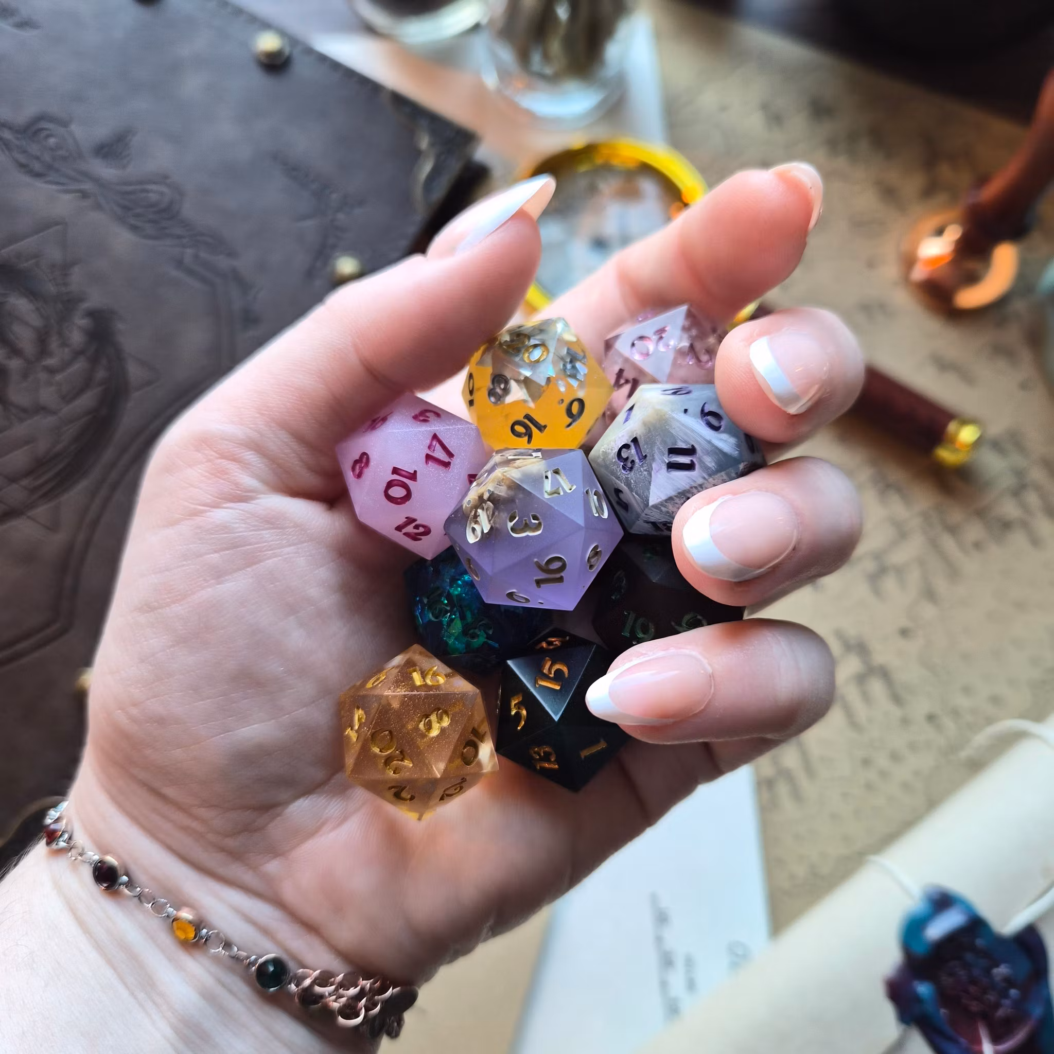 Individual D20s!Beautiful sea-glass purple, bottom side has sunken skulls (unfortunately not in photo), inked in tan. Window finish.Rich burgundy contrasted wit