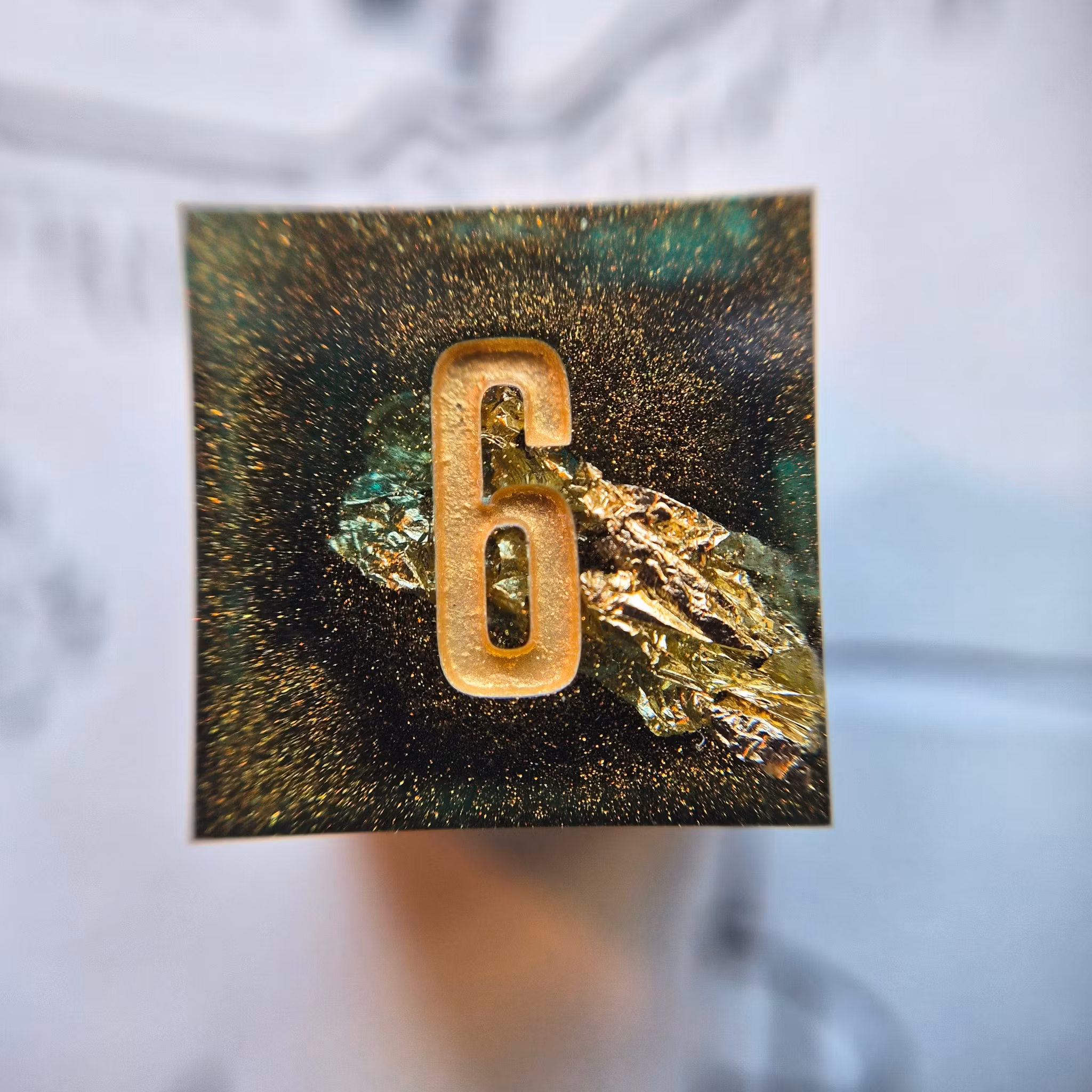 Individual D6s!Dark emerald gothic gold with gold flakes. Shiny finish. - SOLD OUT Transparent sea-glass with gold numbers. Matte finish. - 1 IN STOCKBrigh