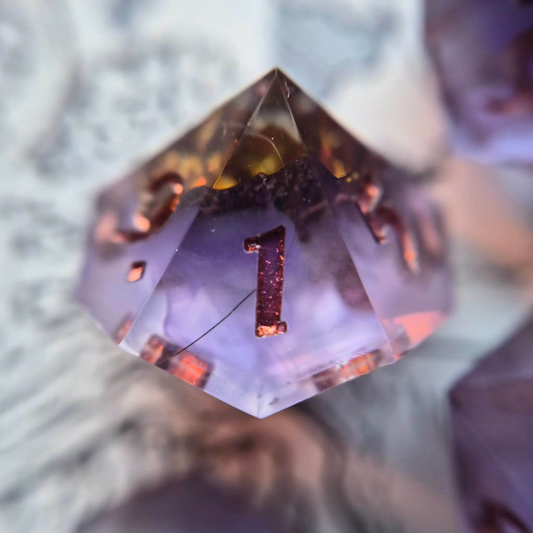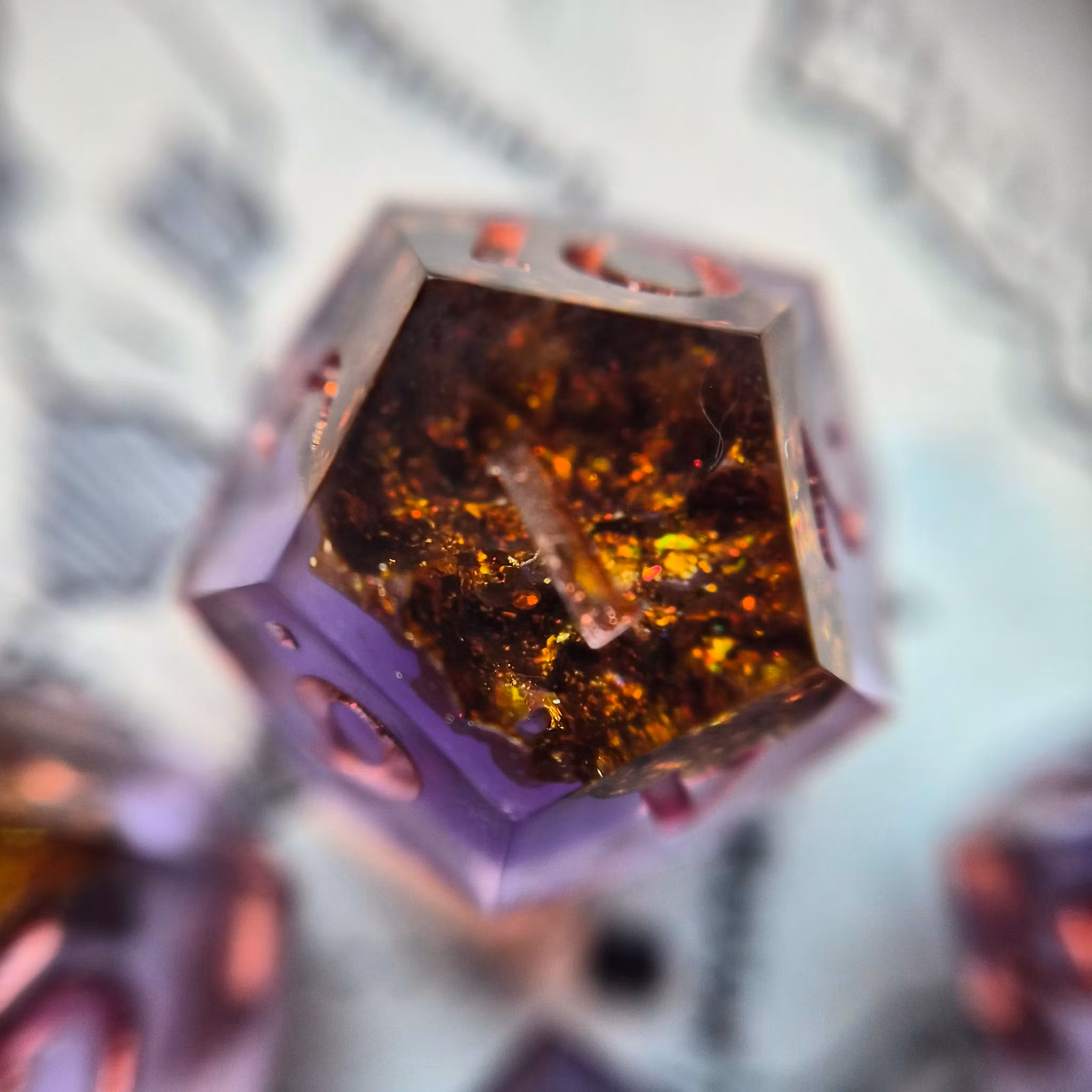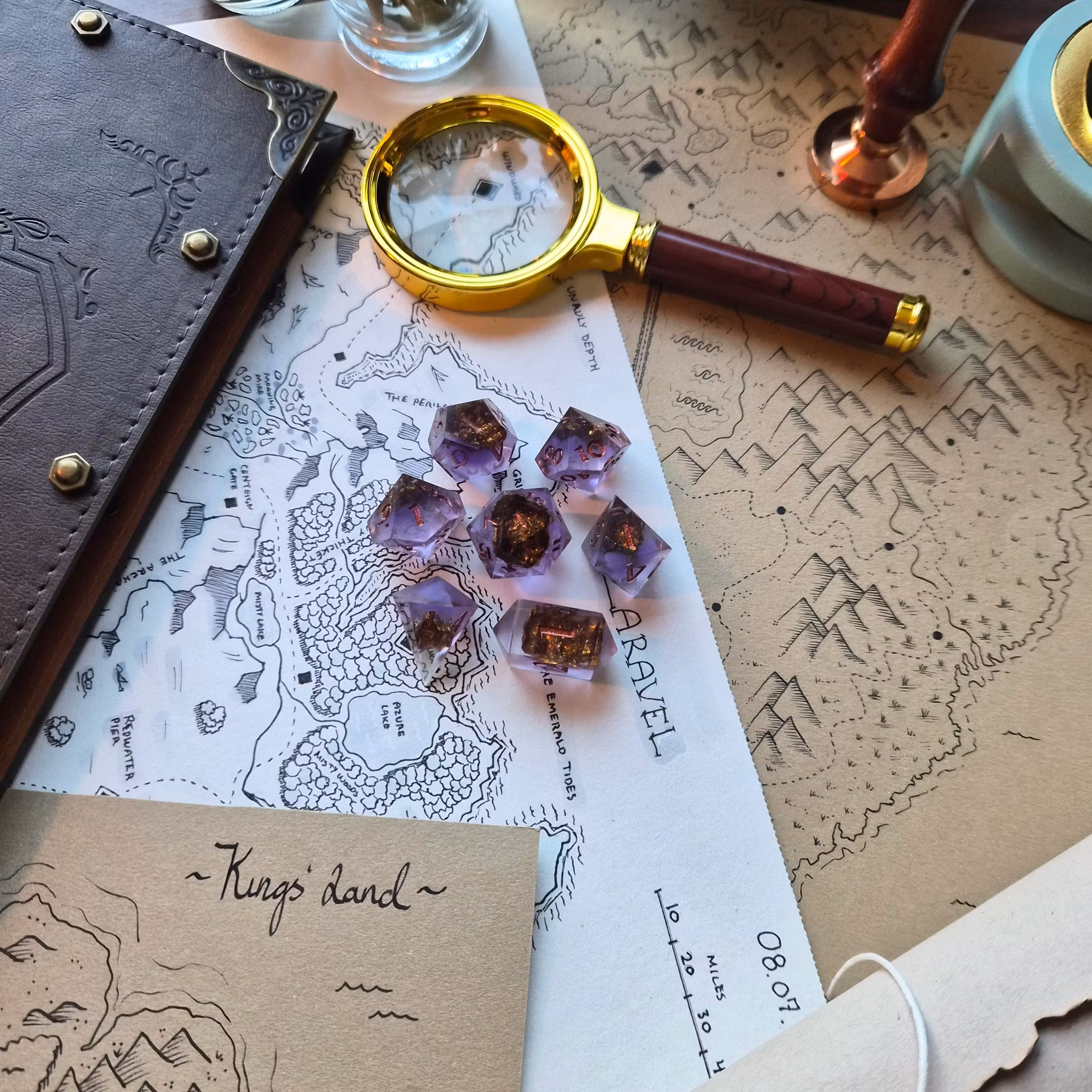 A truly regal geode dice set with purple and bronze tones, inked in a reddish bronze which shimmers from across the room. Polished to a shiny finish. Crafted with Magic.