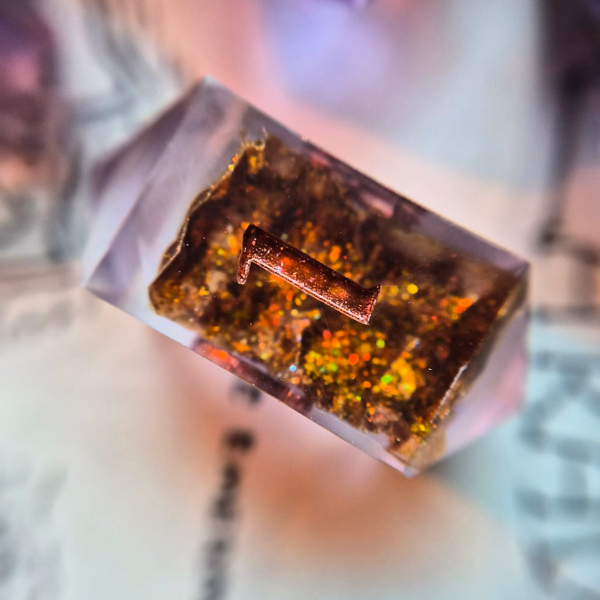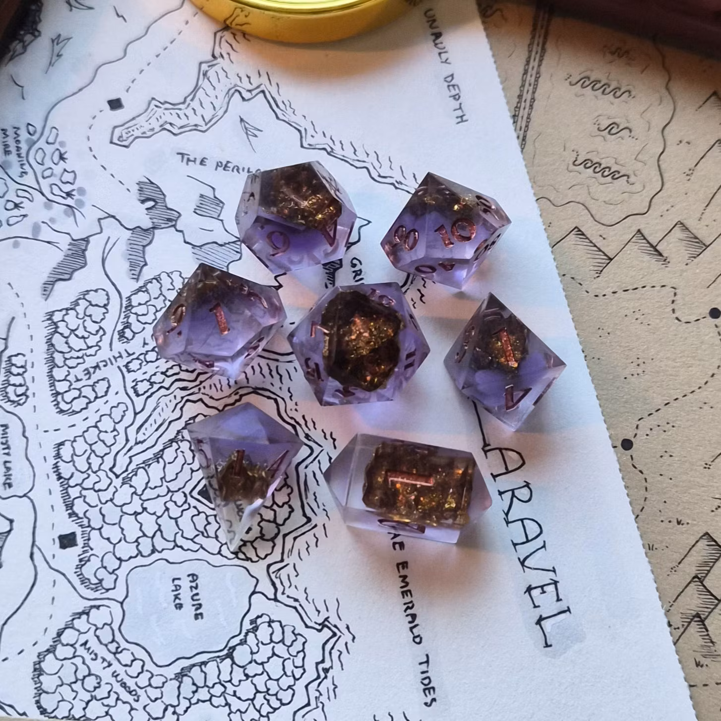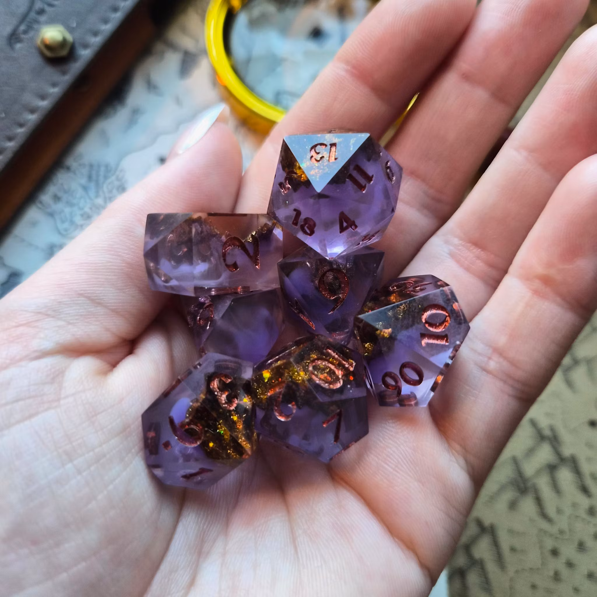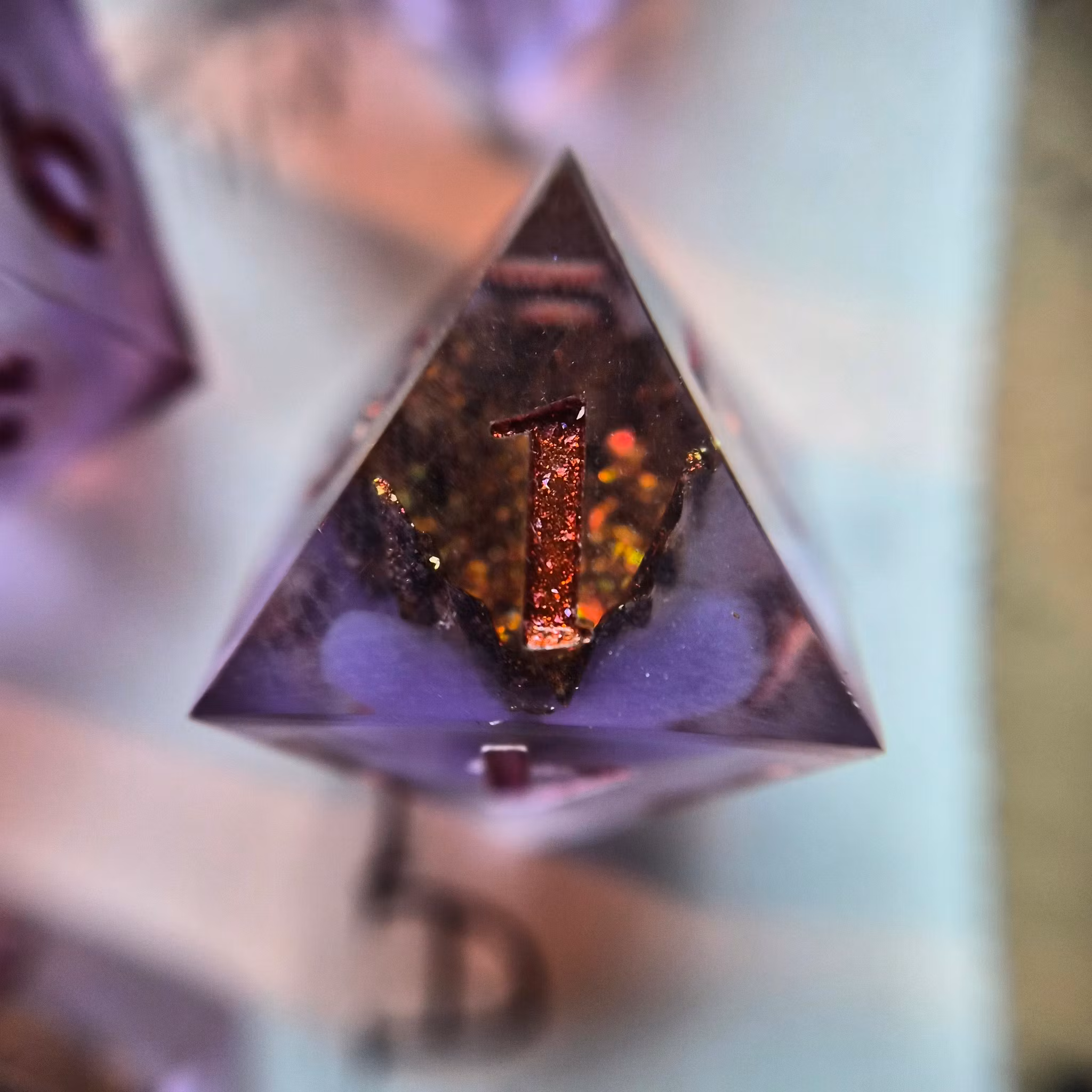 A truly regal geode dice set with purple and bronze tones, inked in a reddish bronze which shimmers from across the room. Polished to a shiny finish. Crafted with Magic.