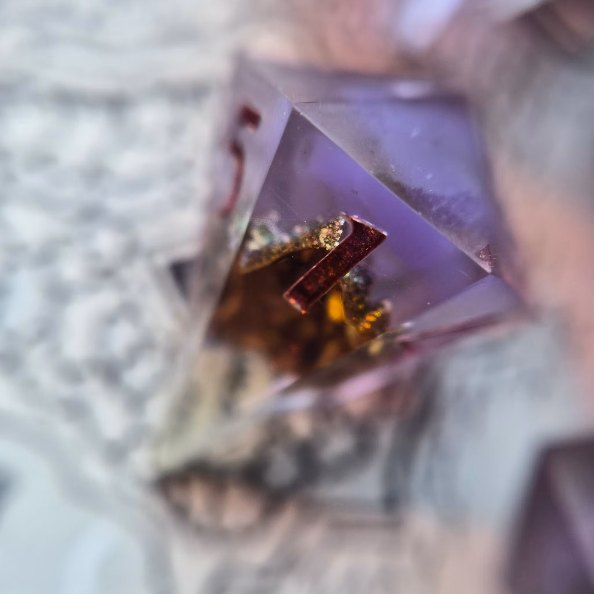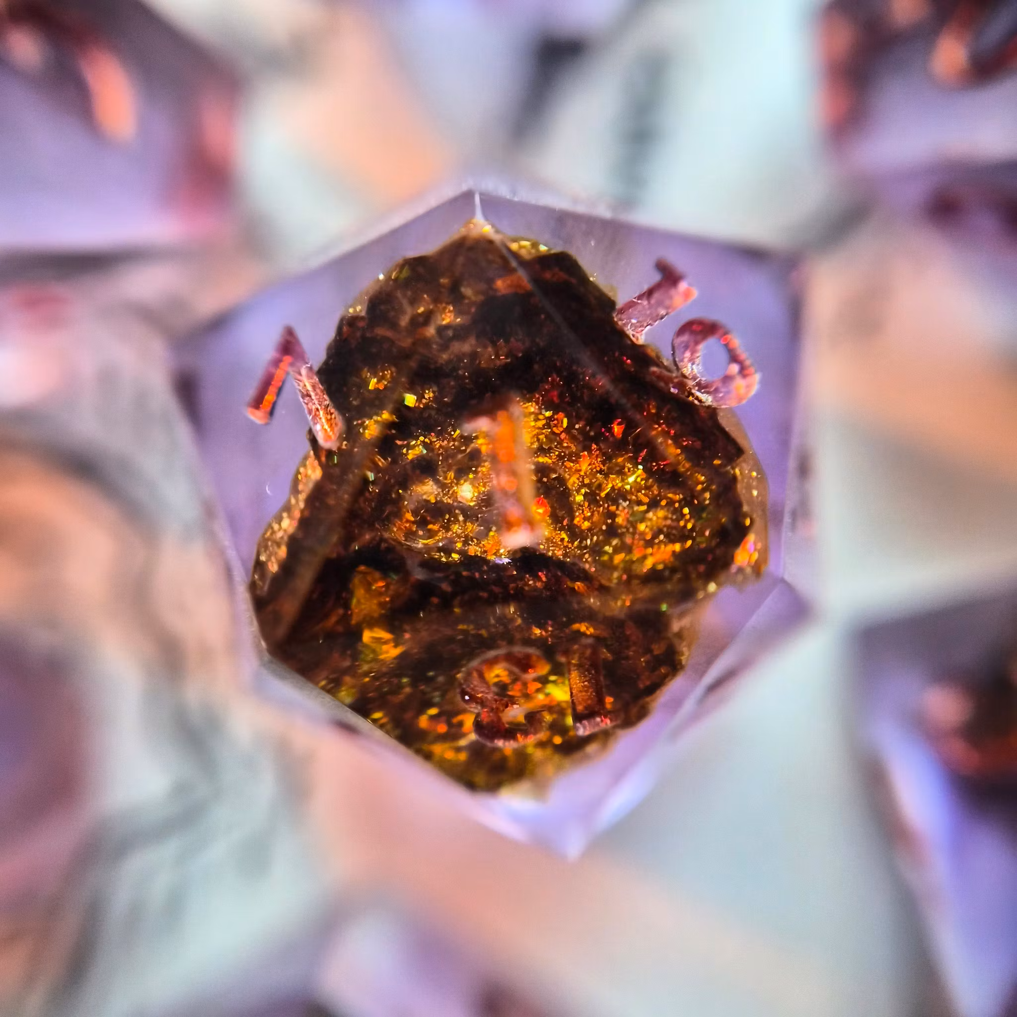 A truly regal geode dice set with purple and bronze tones, inked in a reddish bronze which shimmers from across the room. Polished to a shiny finish.Crafted wit