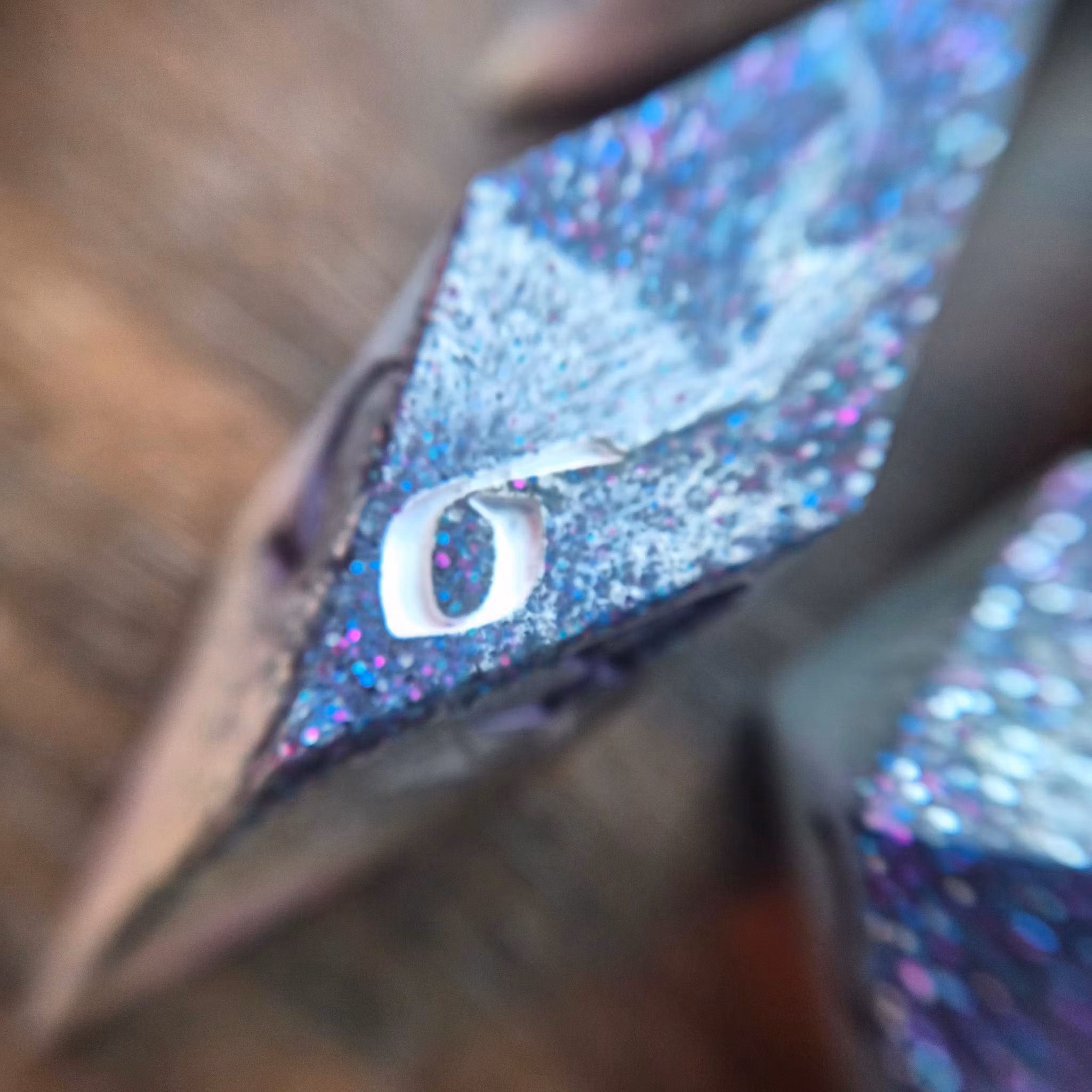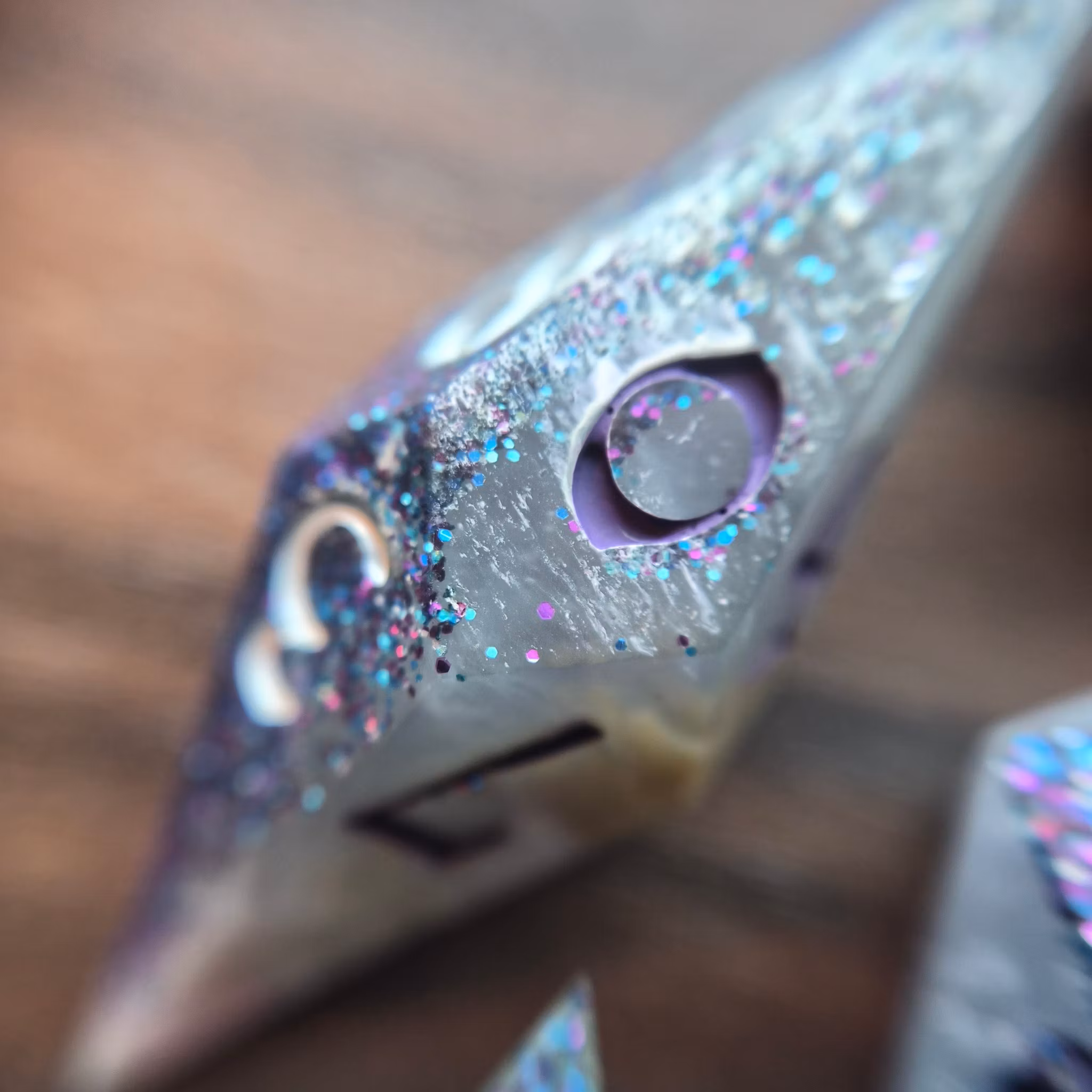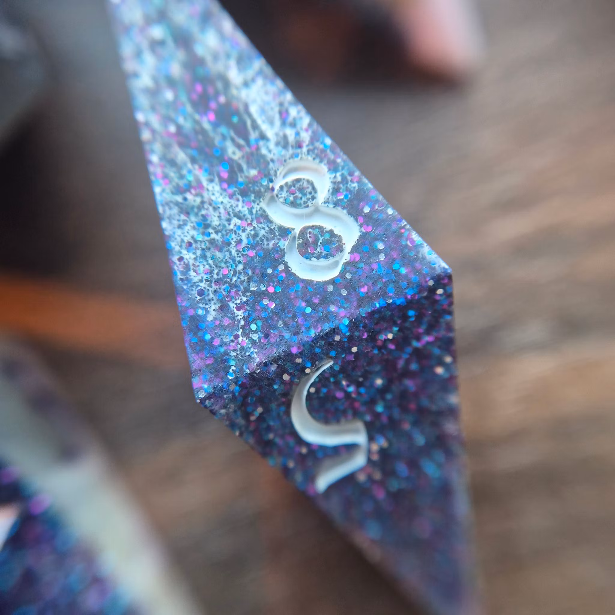 This stunning split-pour set blends a deep, glittery midnight indigo with a swirling, pearlescent white/lavender. Polished to a matte finish. Crafted with Magic.