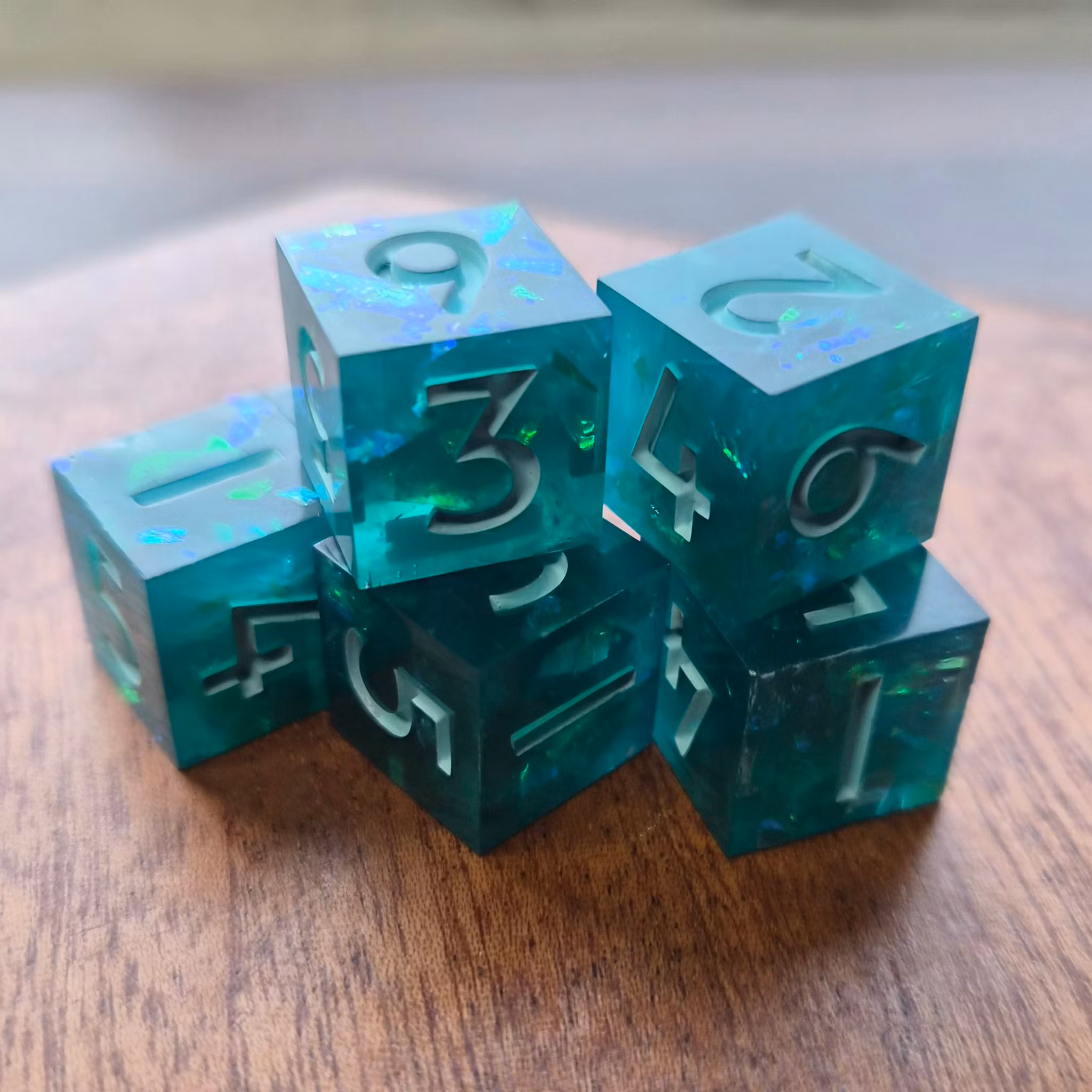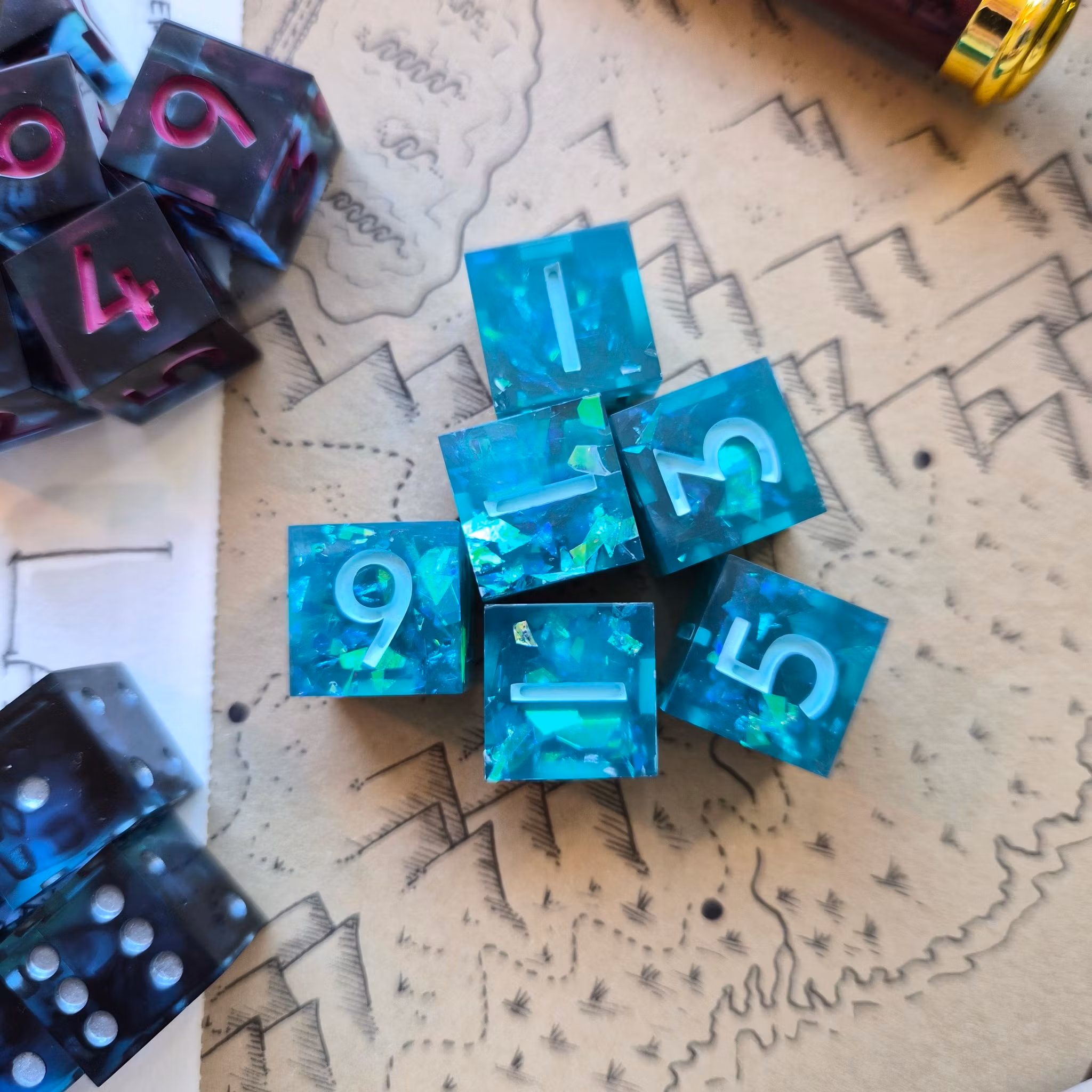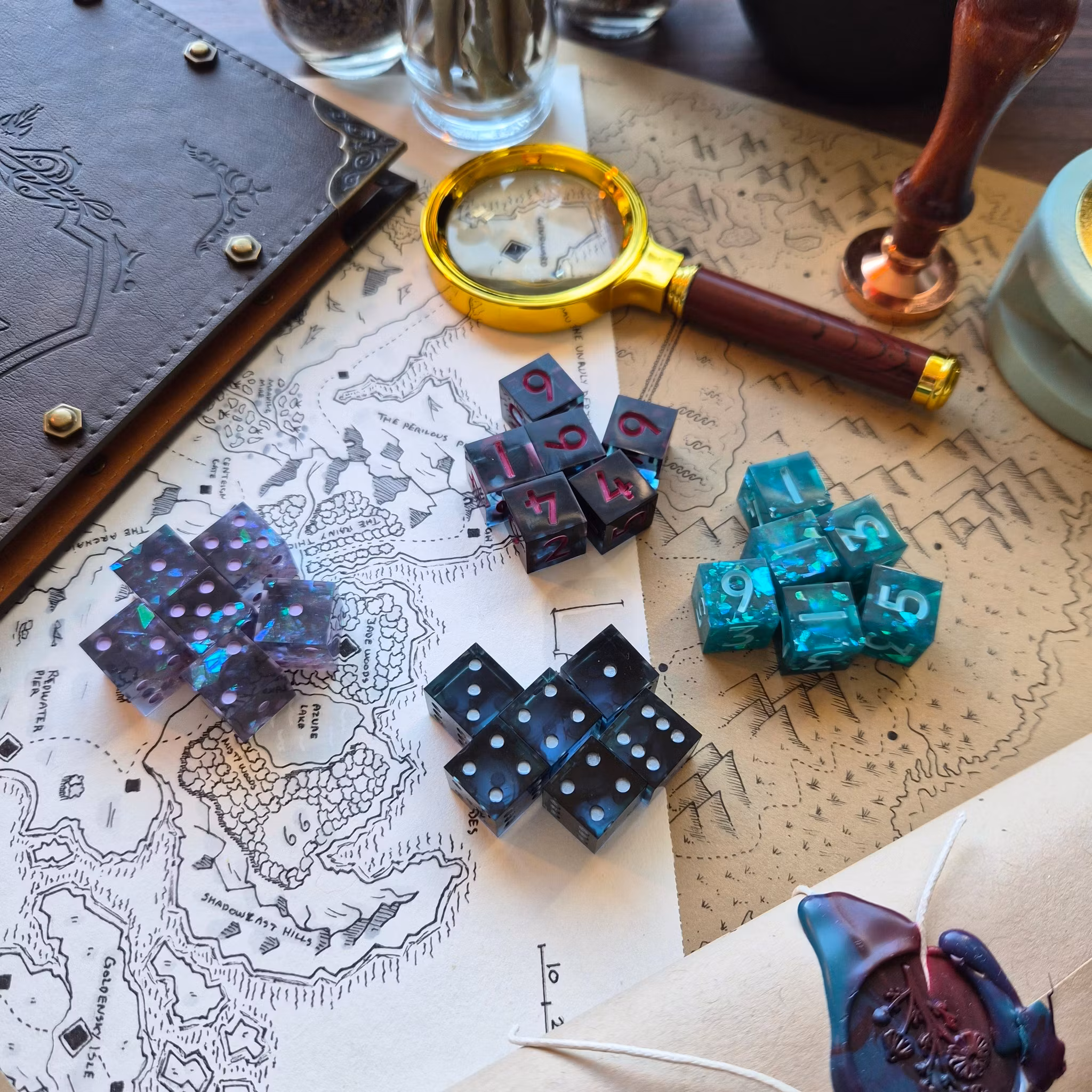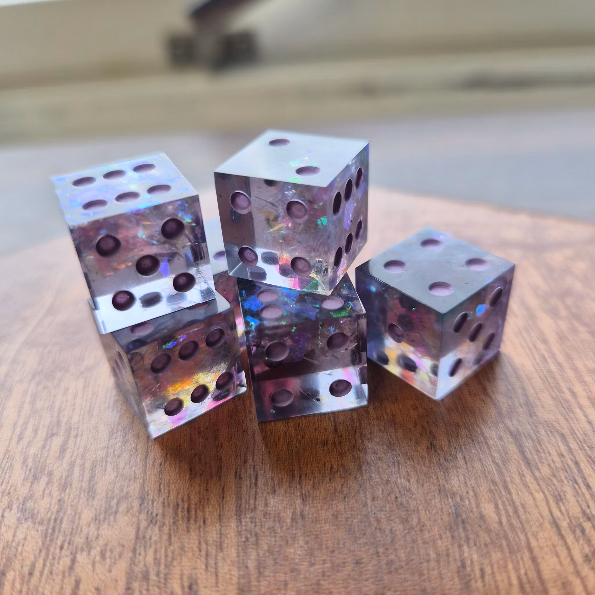 Four different D6 sets:Set one is a transparent blue-grey with holographic flakes, inked in lavender. Polished to a shiny finish. Dots. 700 NOK. - 1 IN STOCKSet