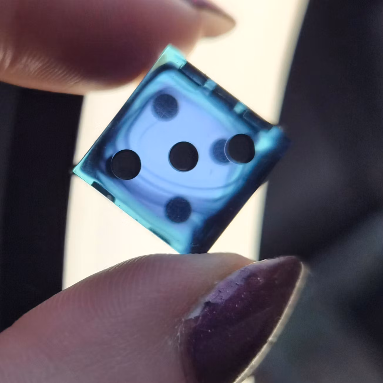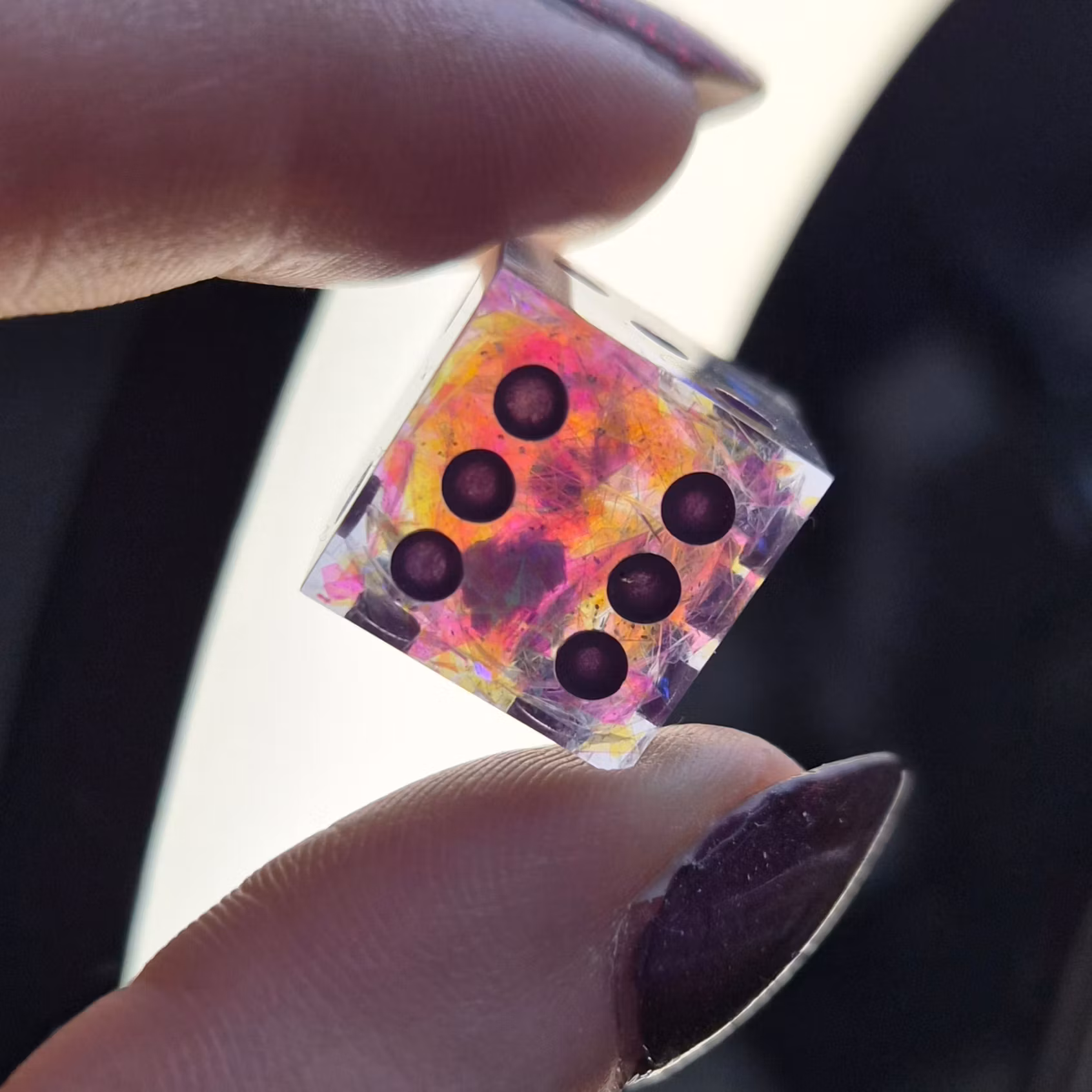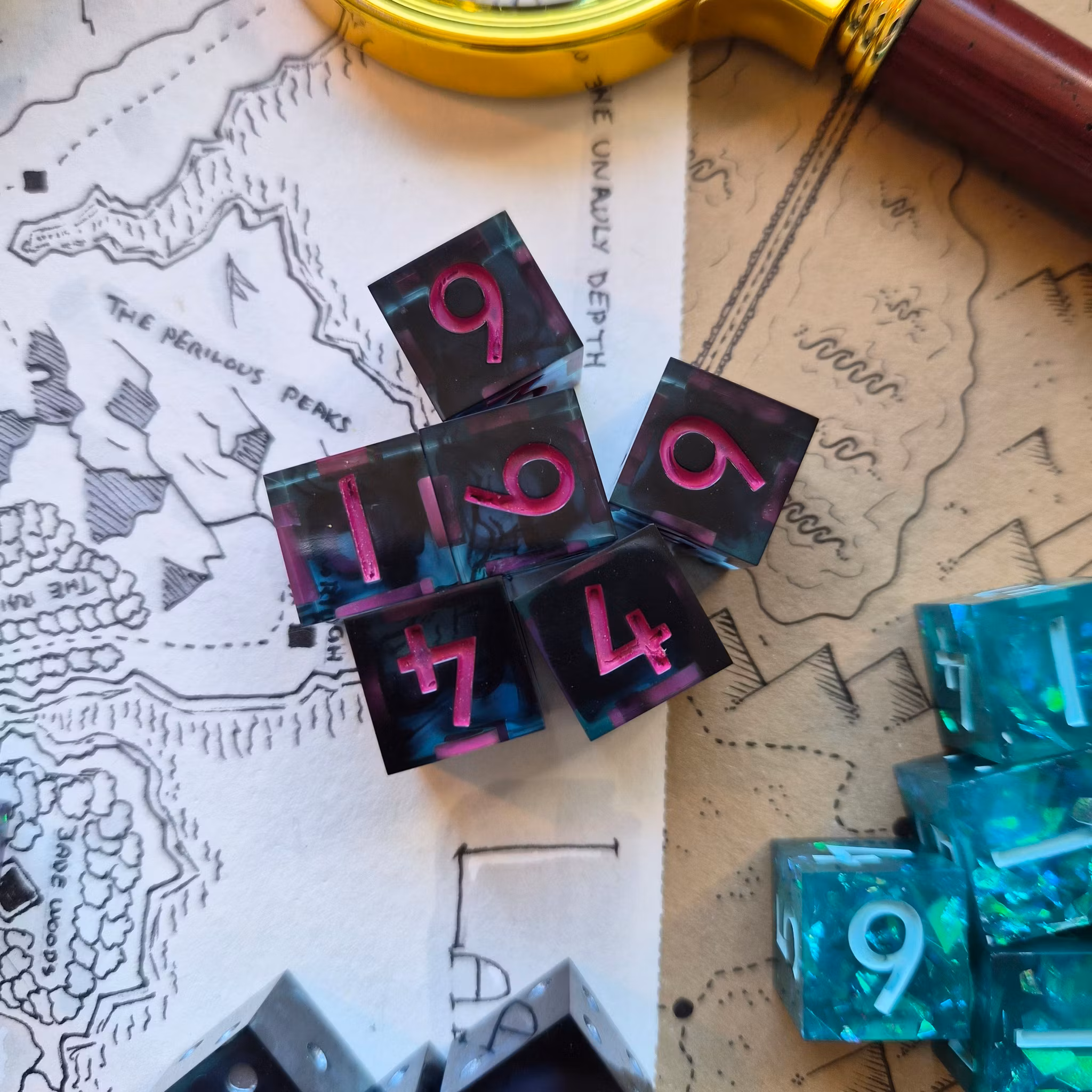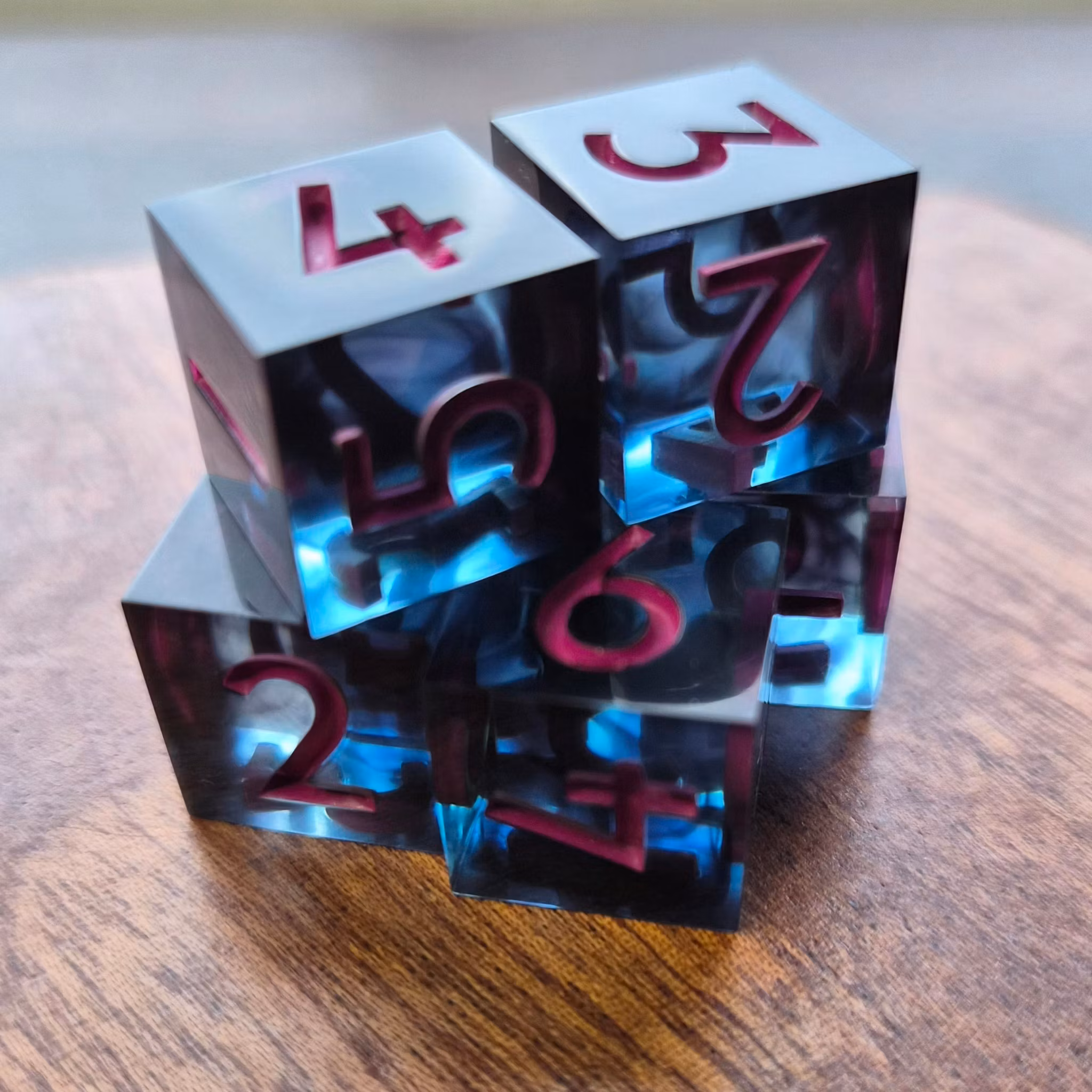 Four different D6 sets:Set one is a transparent blue-grey with holographic flakes, inked in lavender. Polished to a shiny finish. Dots. 700 NOK. - 1 IN STOCKSet