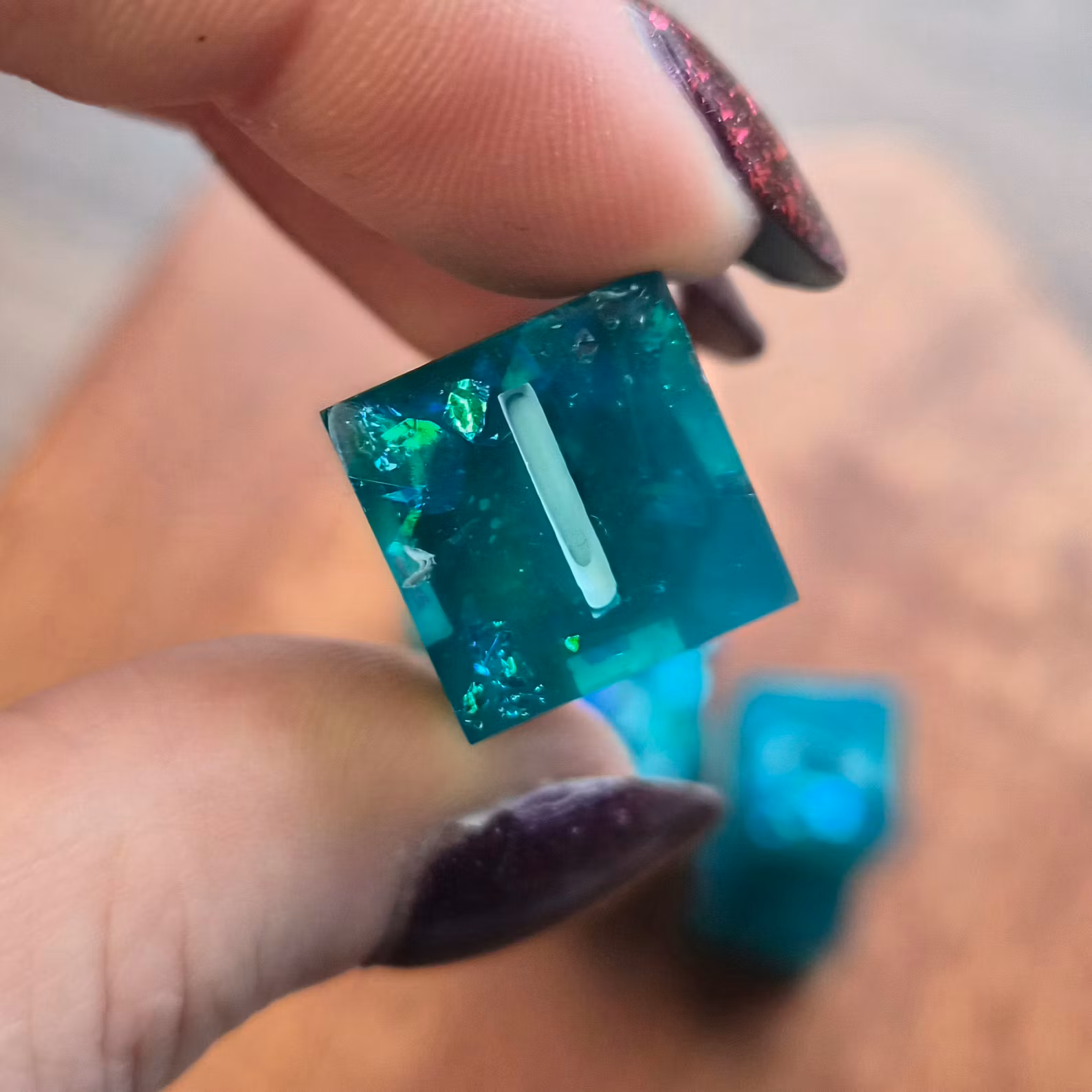 Set three is a transparent teal with holographic flakes, inked in a minty green. Polished to a shiny finish. Numbers. 700 NOK.- 1 IN STOCK
