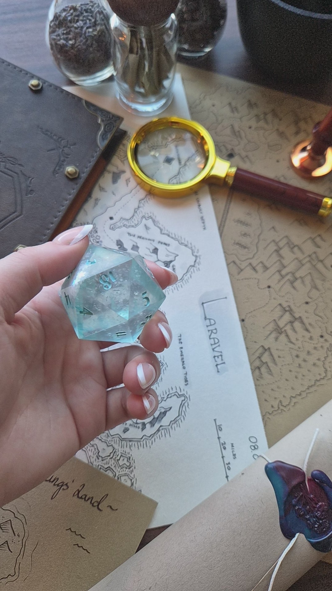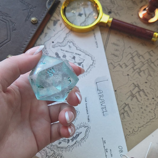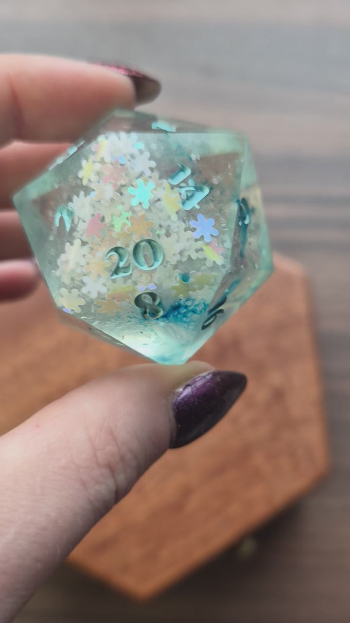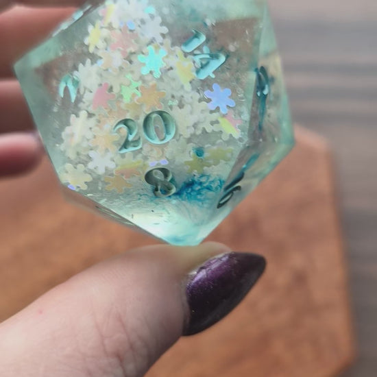 Step up your game with this big 40mm Chonk D20!✨Maybe you love to play giants or just want your inspiration die to have a big impact, who knows? With this chonk, you will achieve that! It is full of snowflake glitters with a blue base, inked in bright blue, and polished to a shiny finish✨