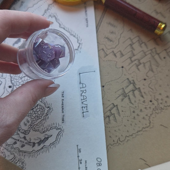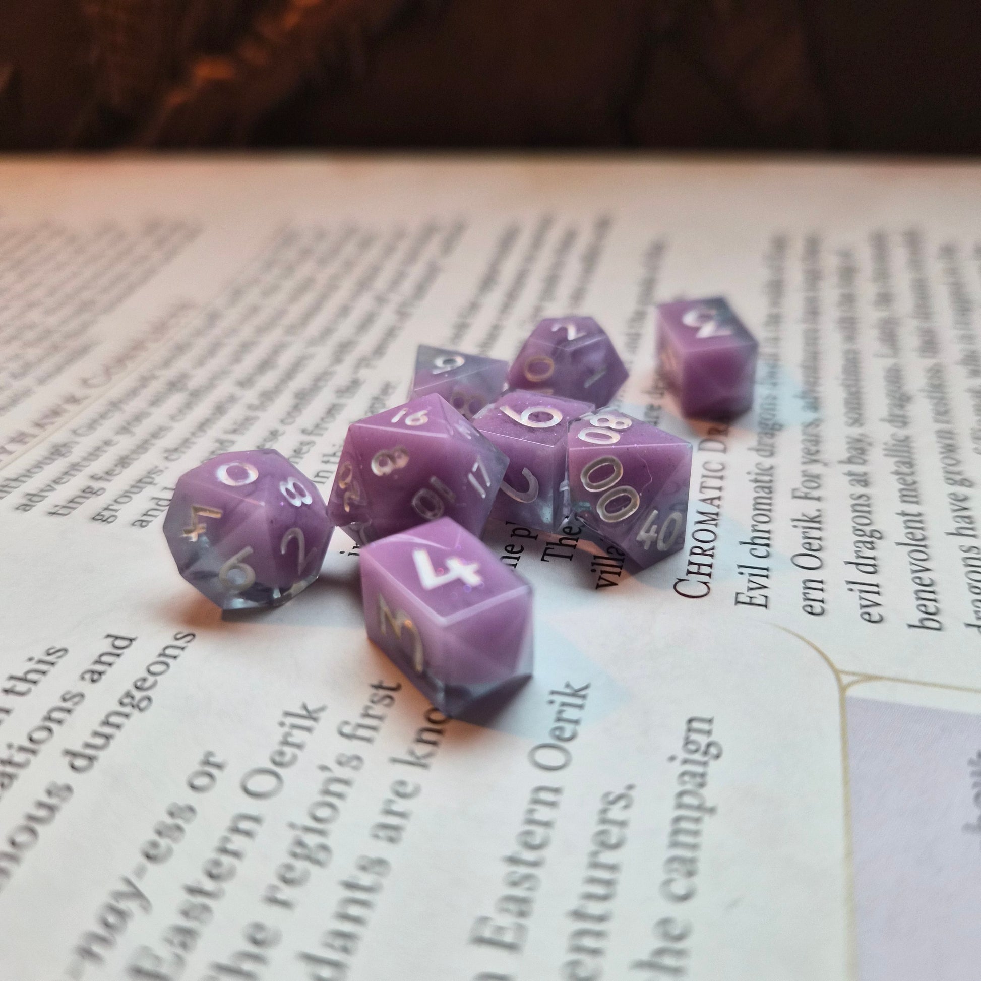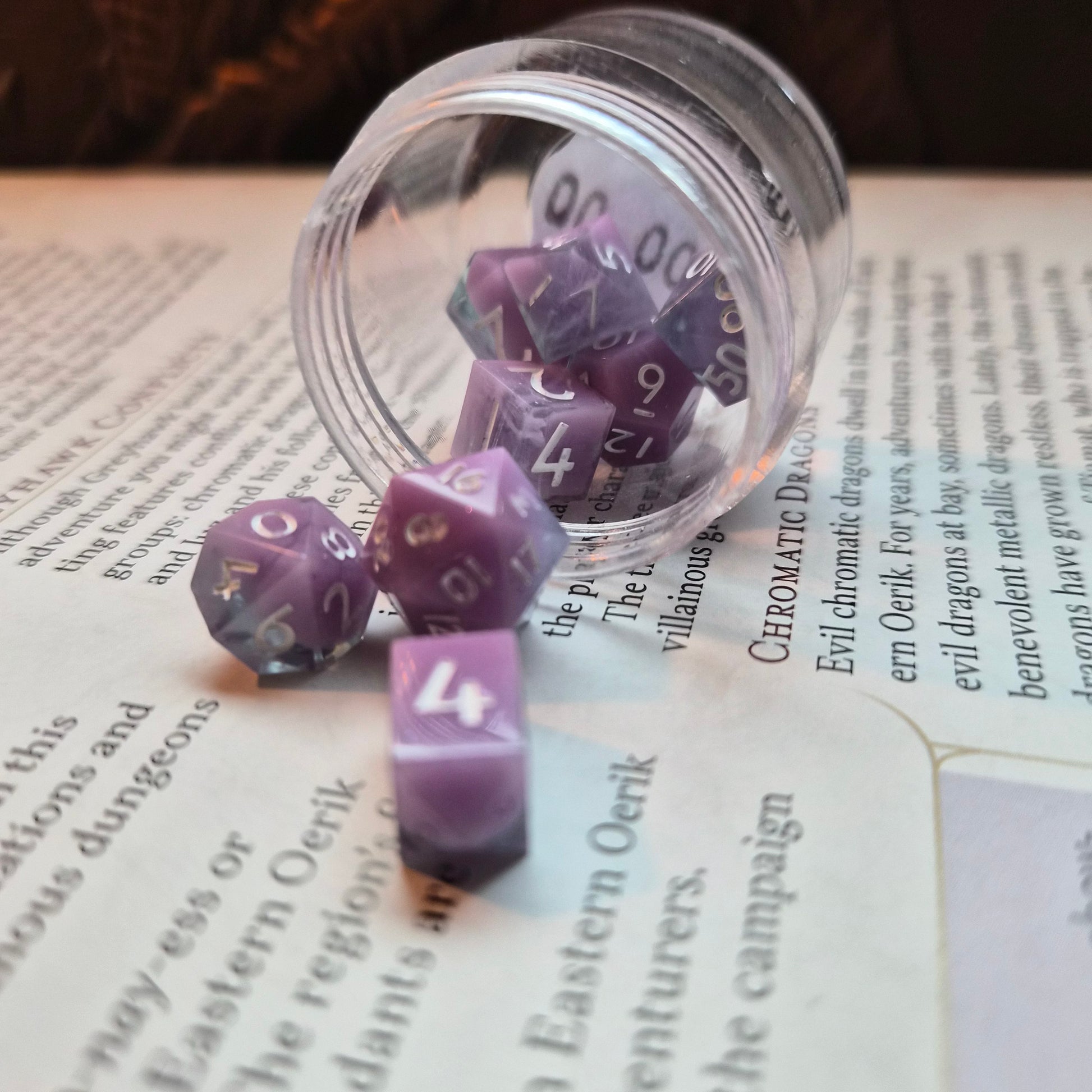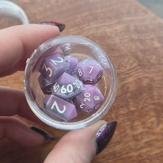 Give your halfling, gnome, or other small ones a set that fits their character! With these mini dice, you are sure to shine at the table✨The set features an opaque lavender colour mixed with a blue translucent blue jelly colour with the numbers inked in white, polished to a shiny finish! The container comes with the set✨