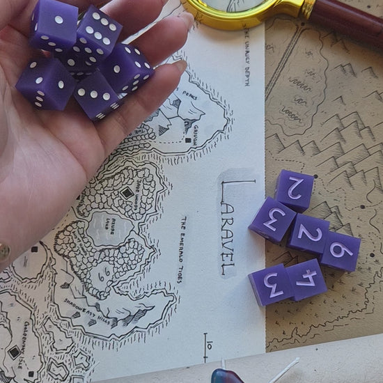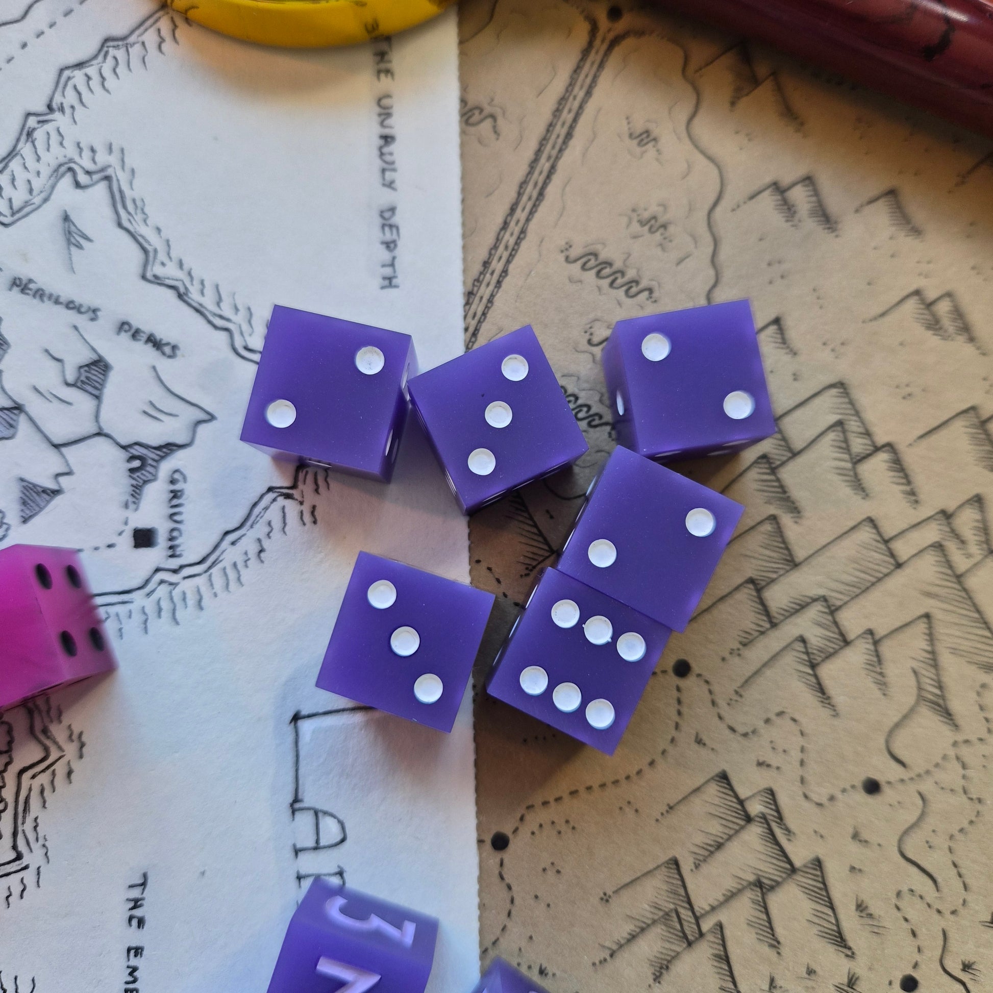 This opaque purple D6 set with white dots are perfect for your cosy game of Yatzy in this dark winter nights. Polished to a matte finish, the dice have a nice soft-touch feel with contrasting sharp edges✨